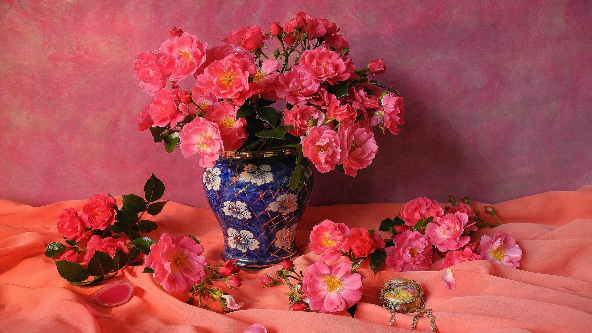 Description: A vase of flowers sitting on a pink cloth with a ring on it and a few other flowers in front of it.