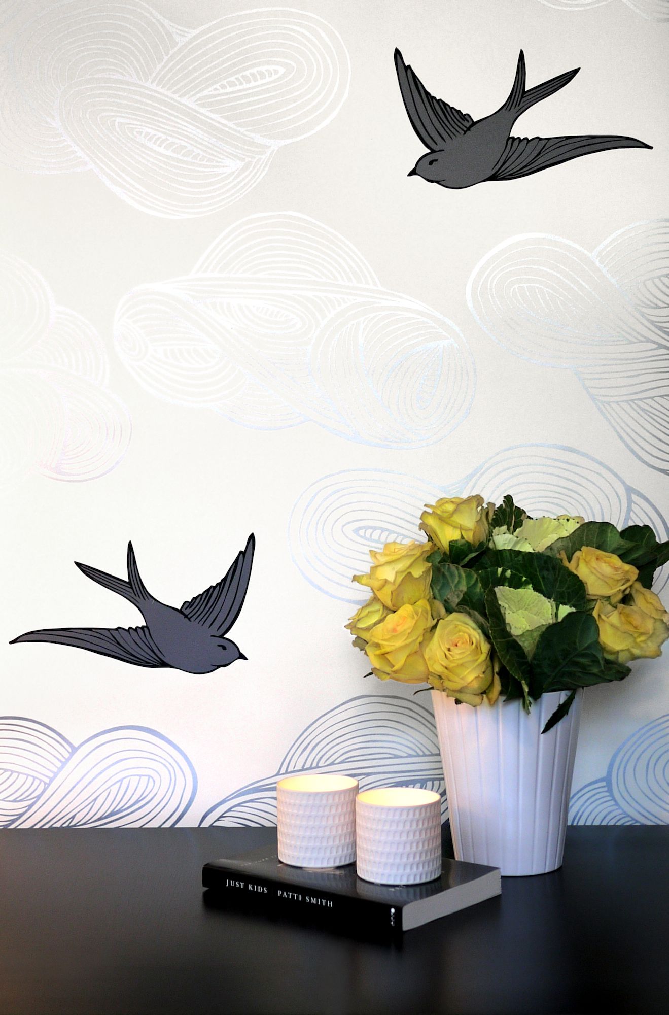 Description: A vase of flowers sitting on a table next to a wall with birds on it and a book on the table.