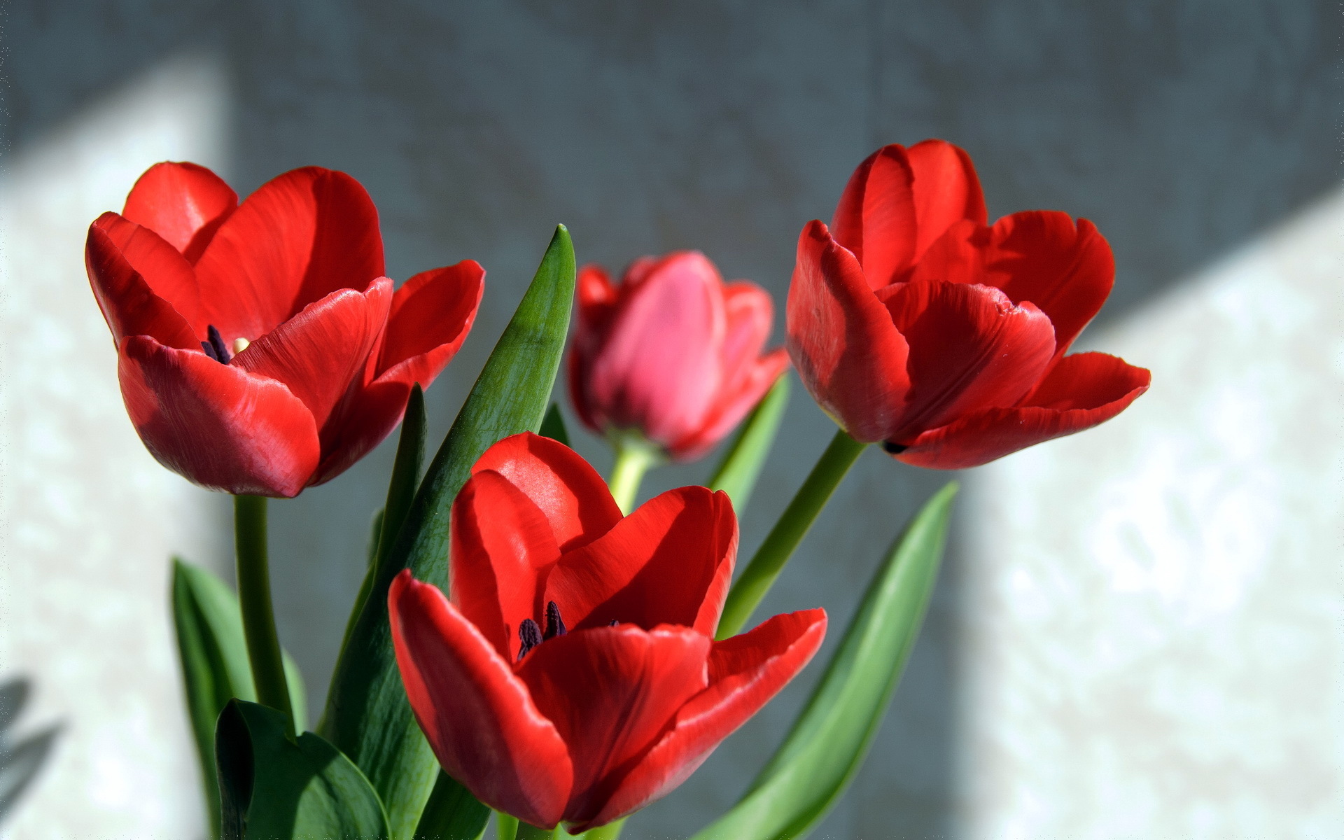 Description: A vase filled with red flowers on top of a table next to a wall and a shadow of a person.