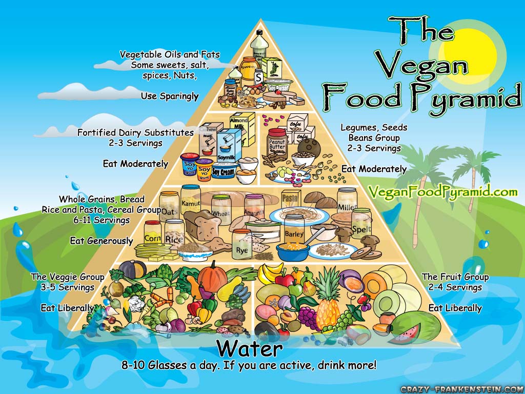 Description: A pyramid of food pyramid with the words the vegan food pyramid written below it and a picture of a variety of foods on it.