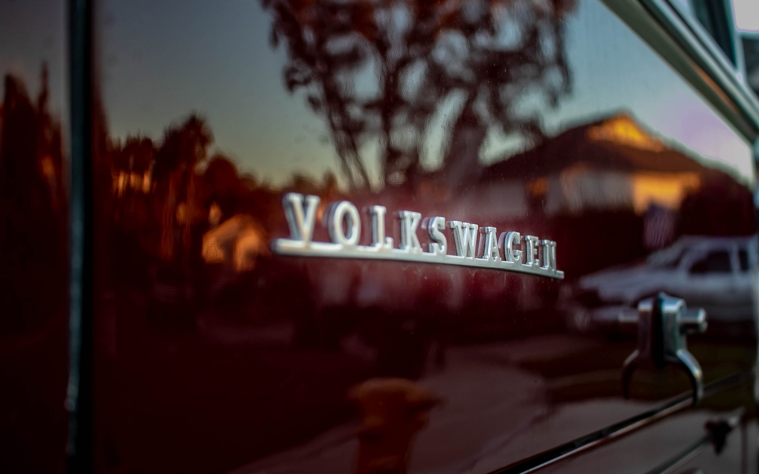 Description: A close up of a vehicle door with the word volkswagen on it's side window.