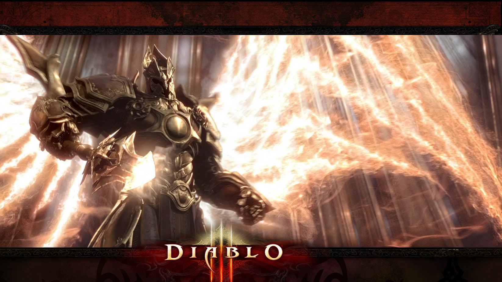 Description: A video game character with a sword and armor in front of a fire background with a demon in the center.