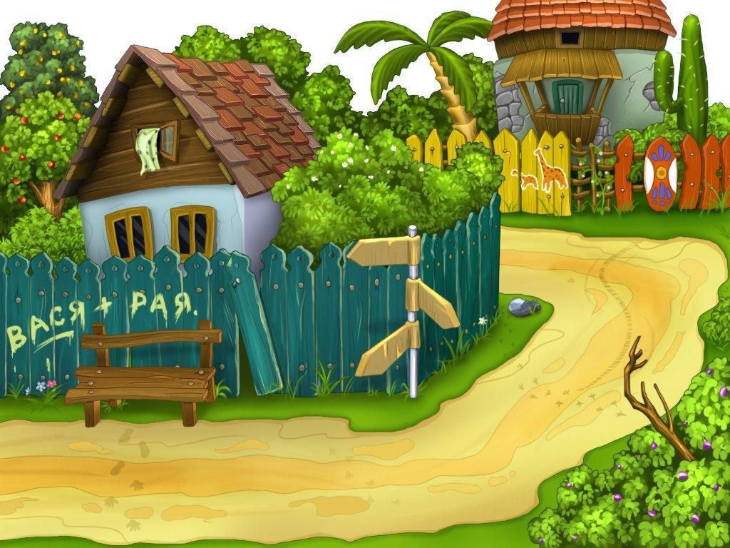 Description: A cartoon of a small village with a road and a sign pointing to the right and a wooden fence with a sign pointing to the left.