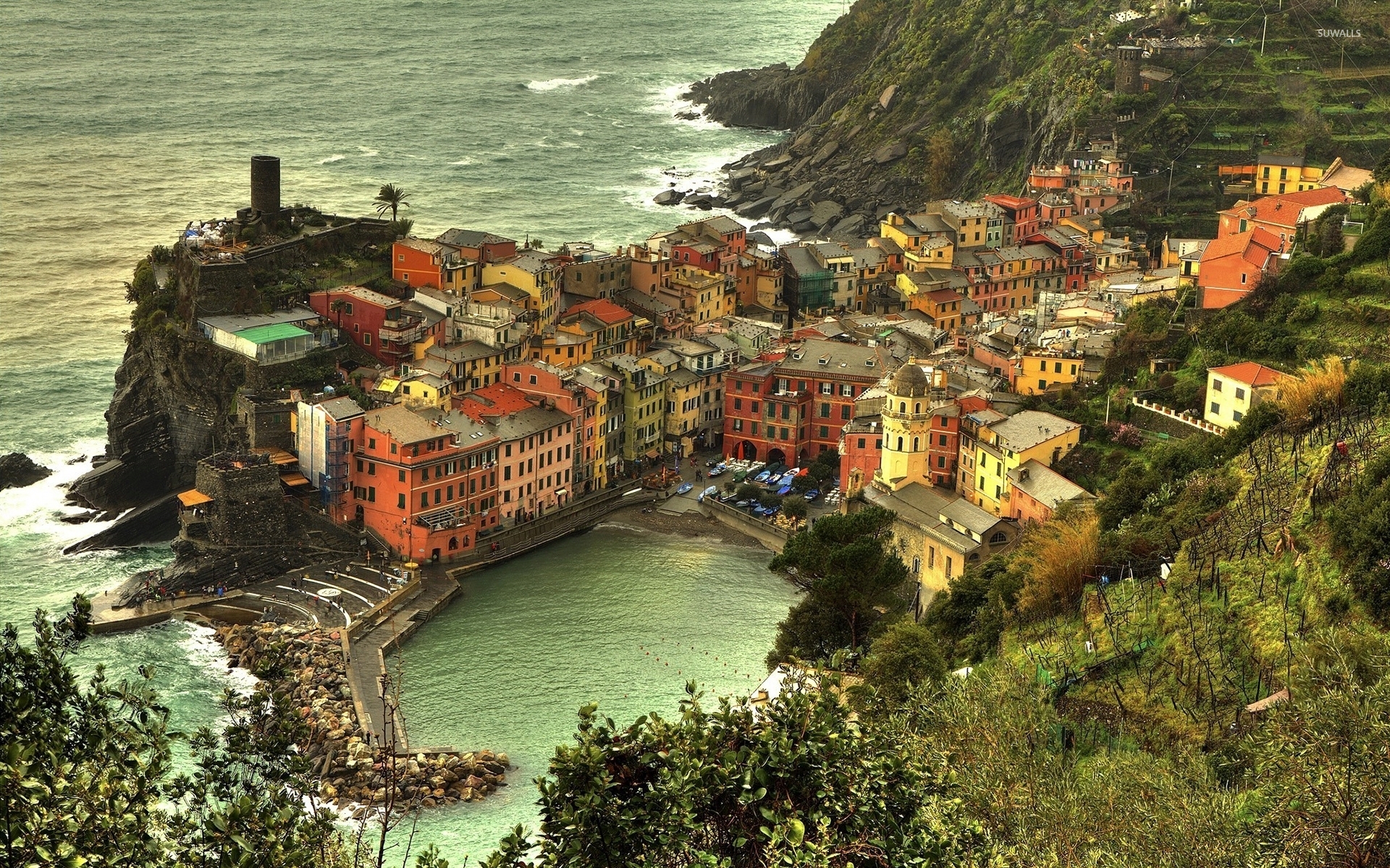 Description: A village on a cliff overlooking the ocean and a cliff side town on the edge of the water with a cliff in the foreground.
