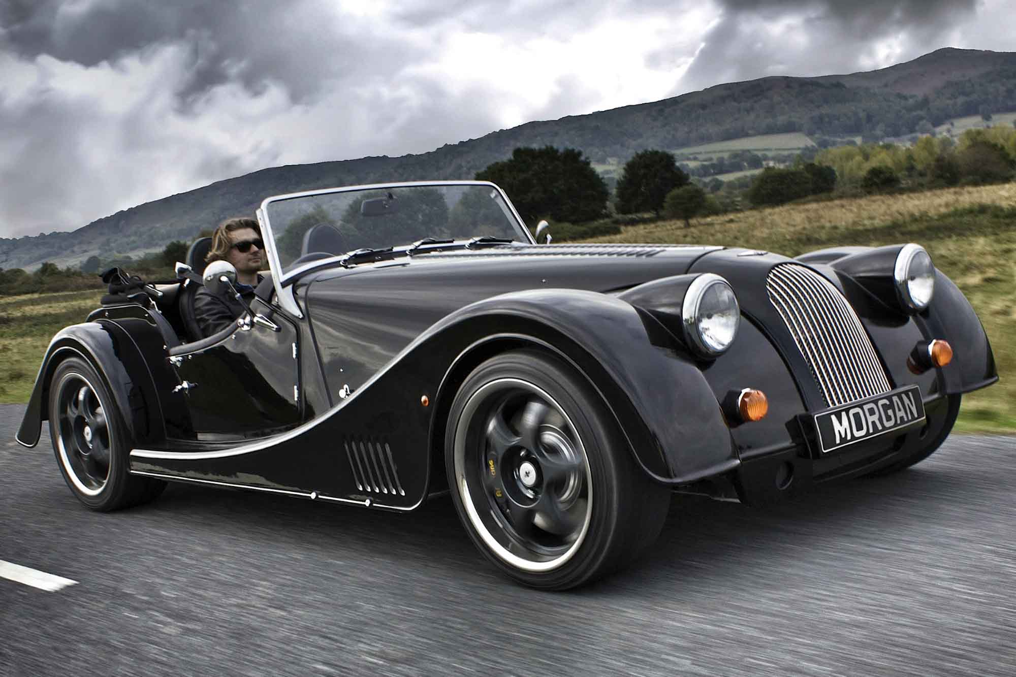 Description: A man driving a vintage black sports car on a road with a cloudy sky in the background and a mountain range in the distance.