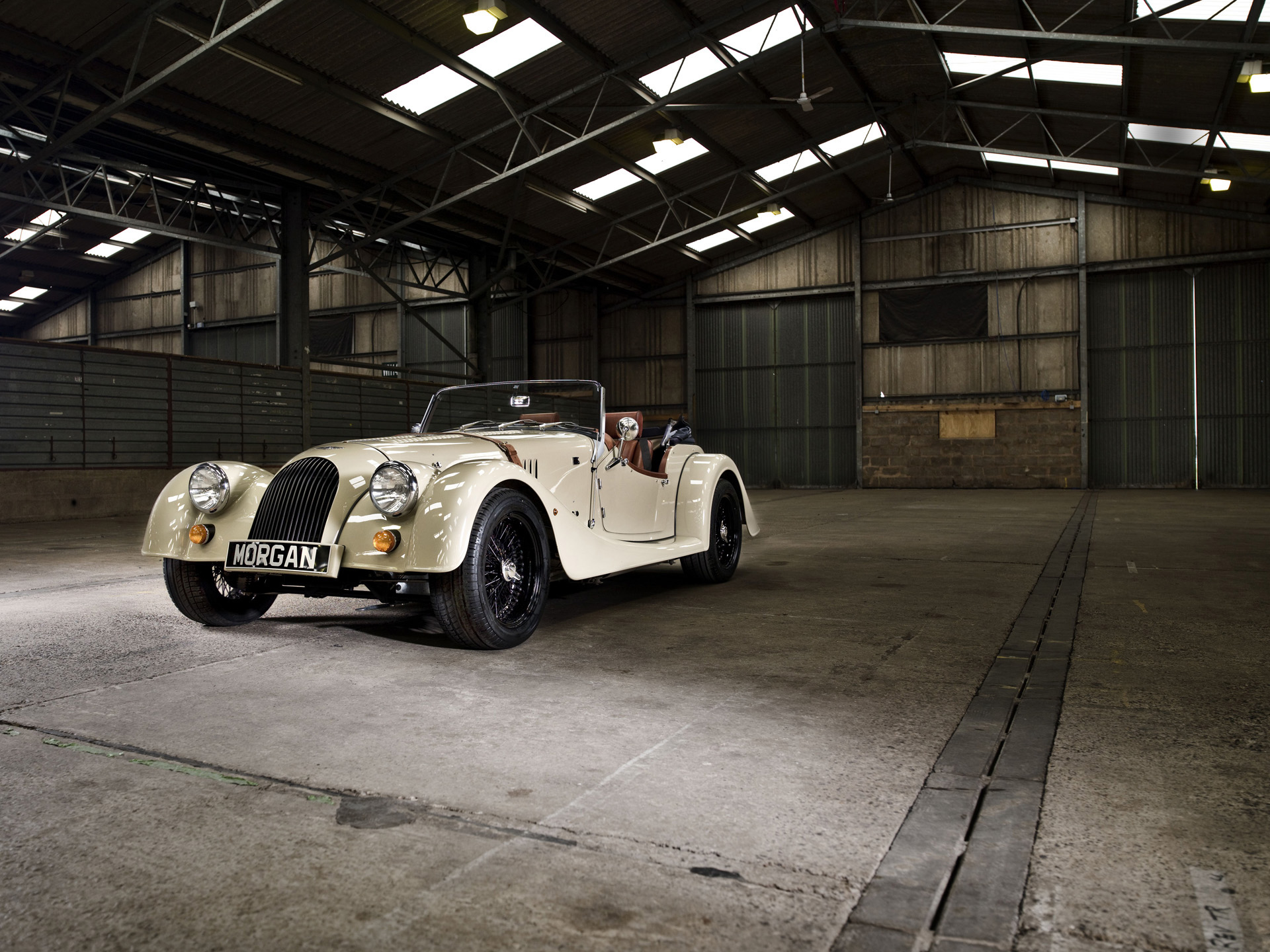 Description: A vintage car parked in a garage with a roof open and a man in the top seat looking at the camera.
