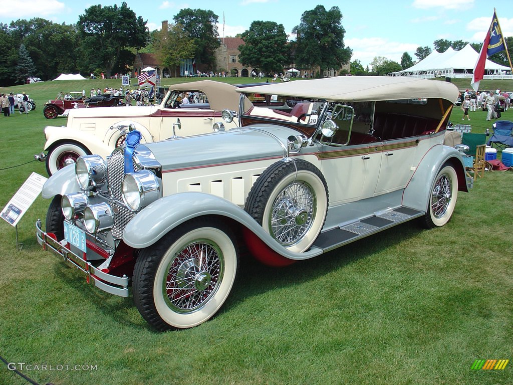 Description: A vintage car parked on a grass field with other cars in the background and people standing around it on the grass.
