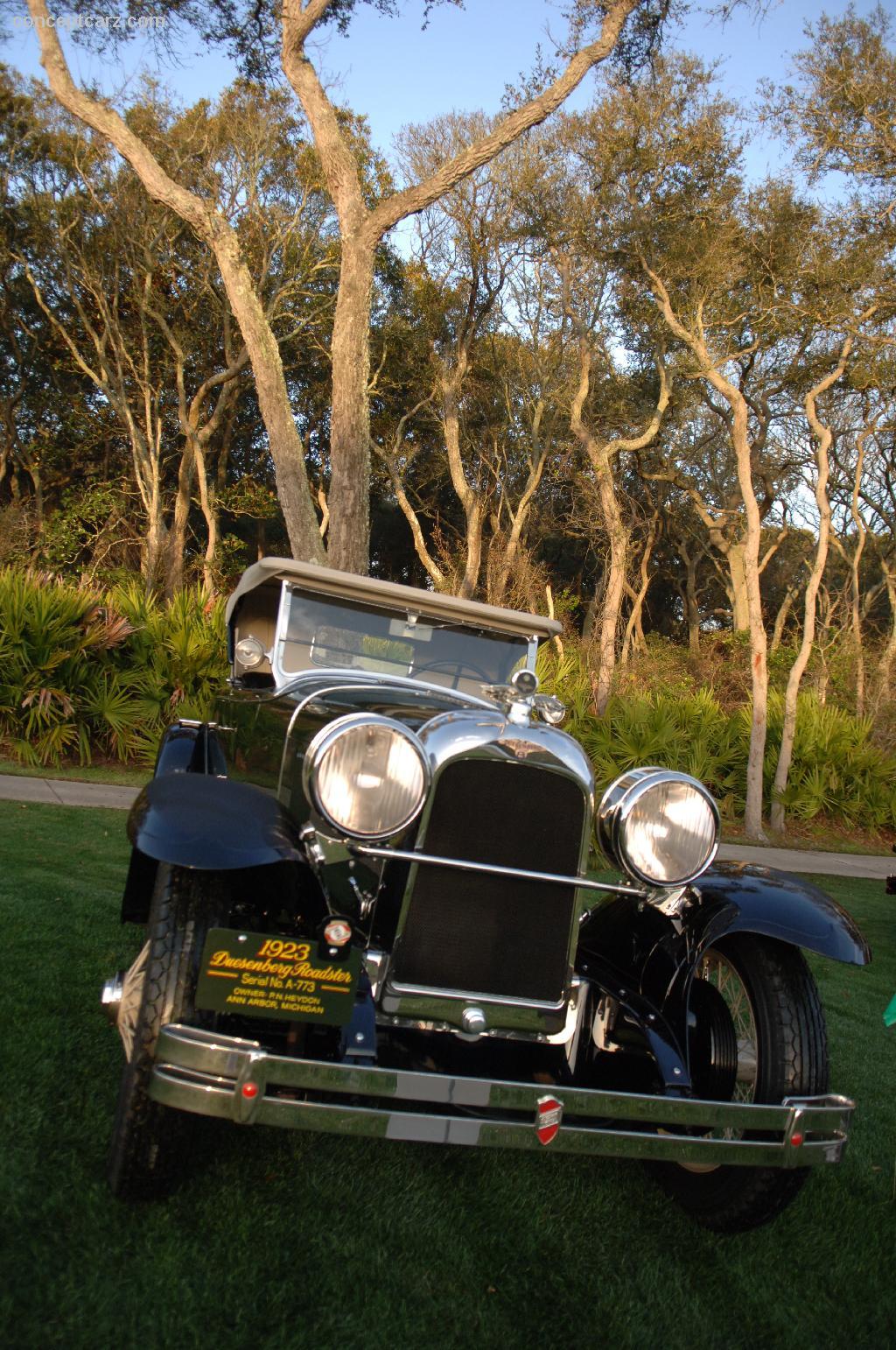 Description: A vintage car parked in the grass near a tree and a road sign with a name on it and a person standing next to it.