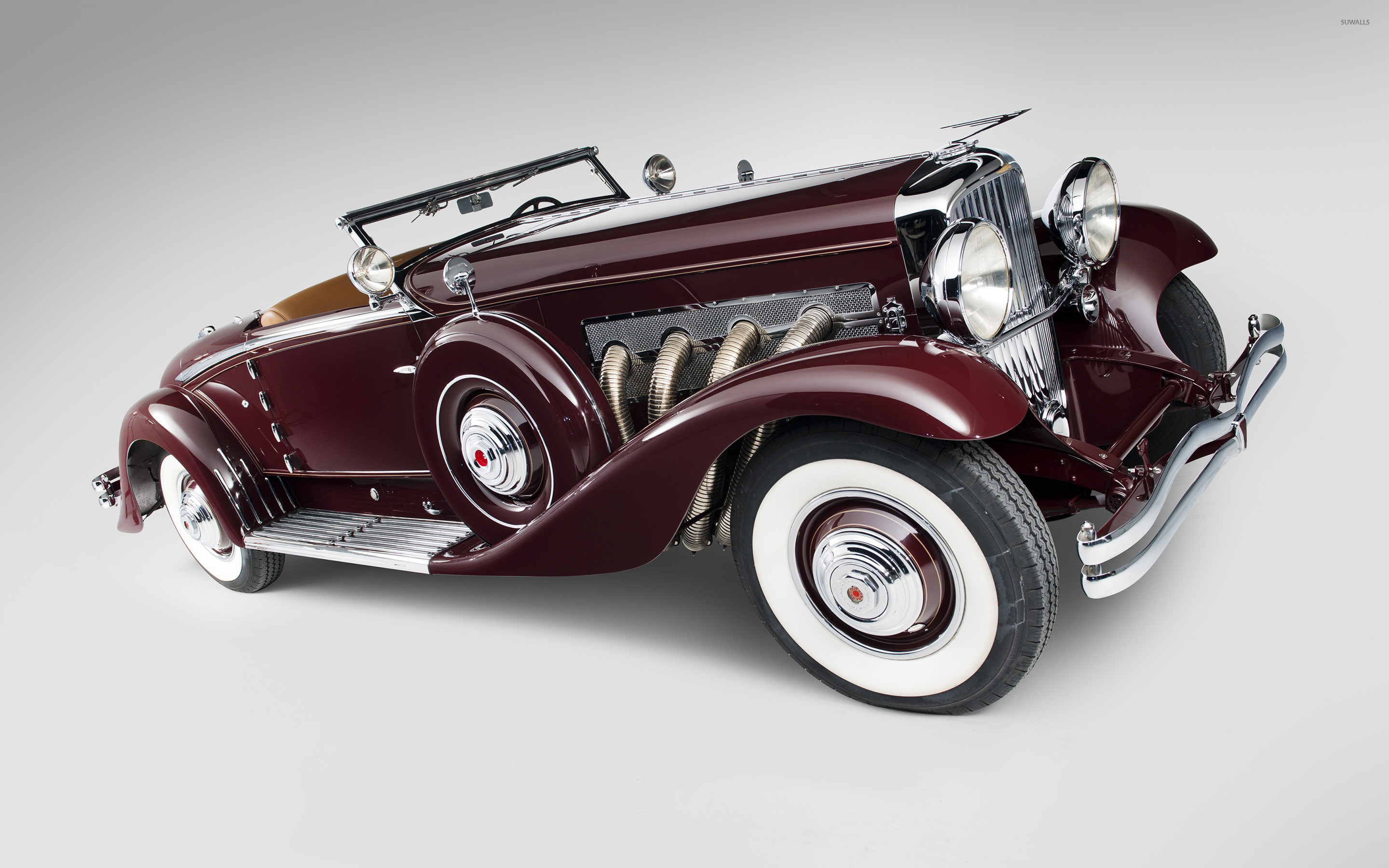 Description: A vintage car with a wooden seat and a leather top is shown in a studio setting with a white background.
