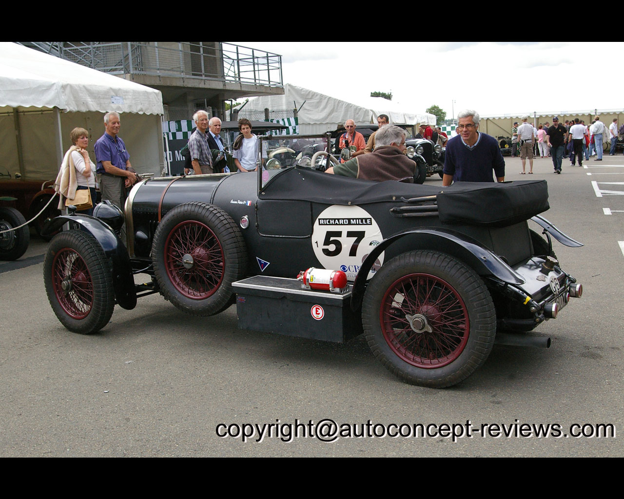 Description: A vintage race car with a number on the side of it and people standing around it in a parking lot.
