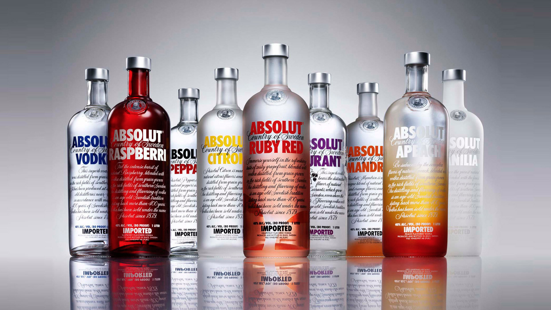 Description: A group of bottles of vodka sitting on top of a table next to each other on a reflective surface.