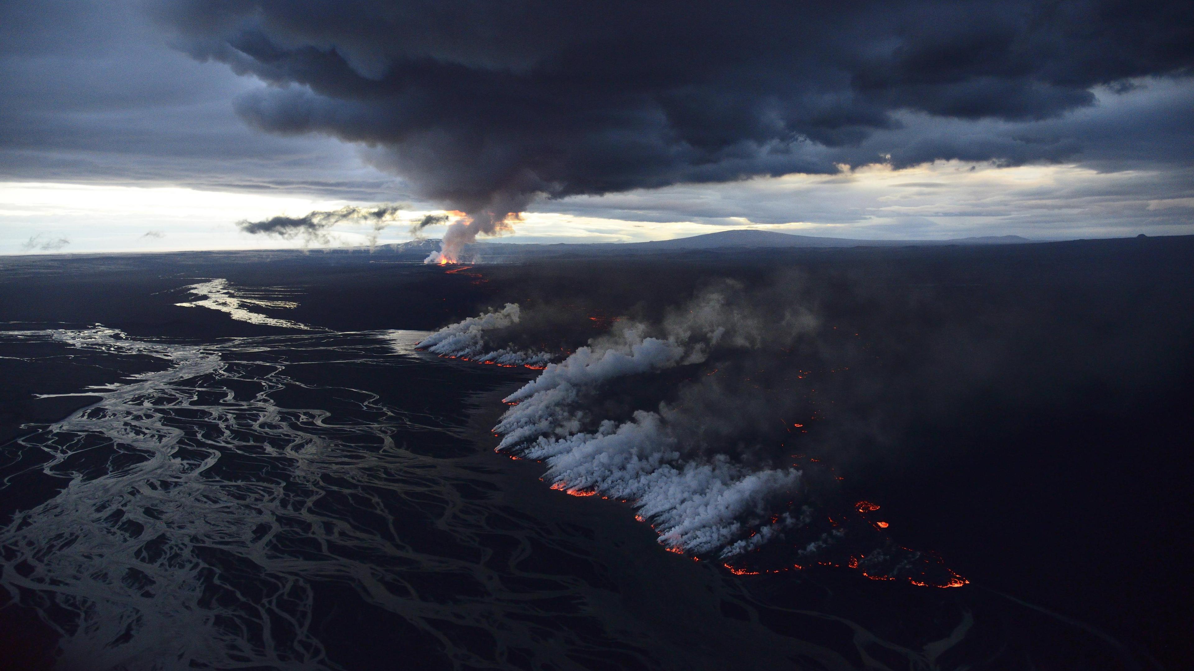 Description: A large plume of smoke and steam rising from a volcano in the ocean at night time with a river running through it.