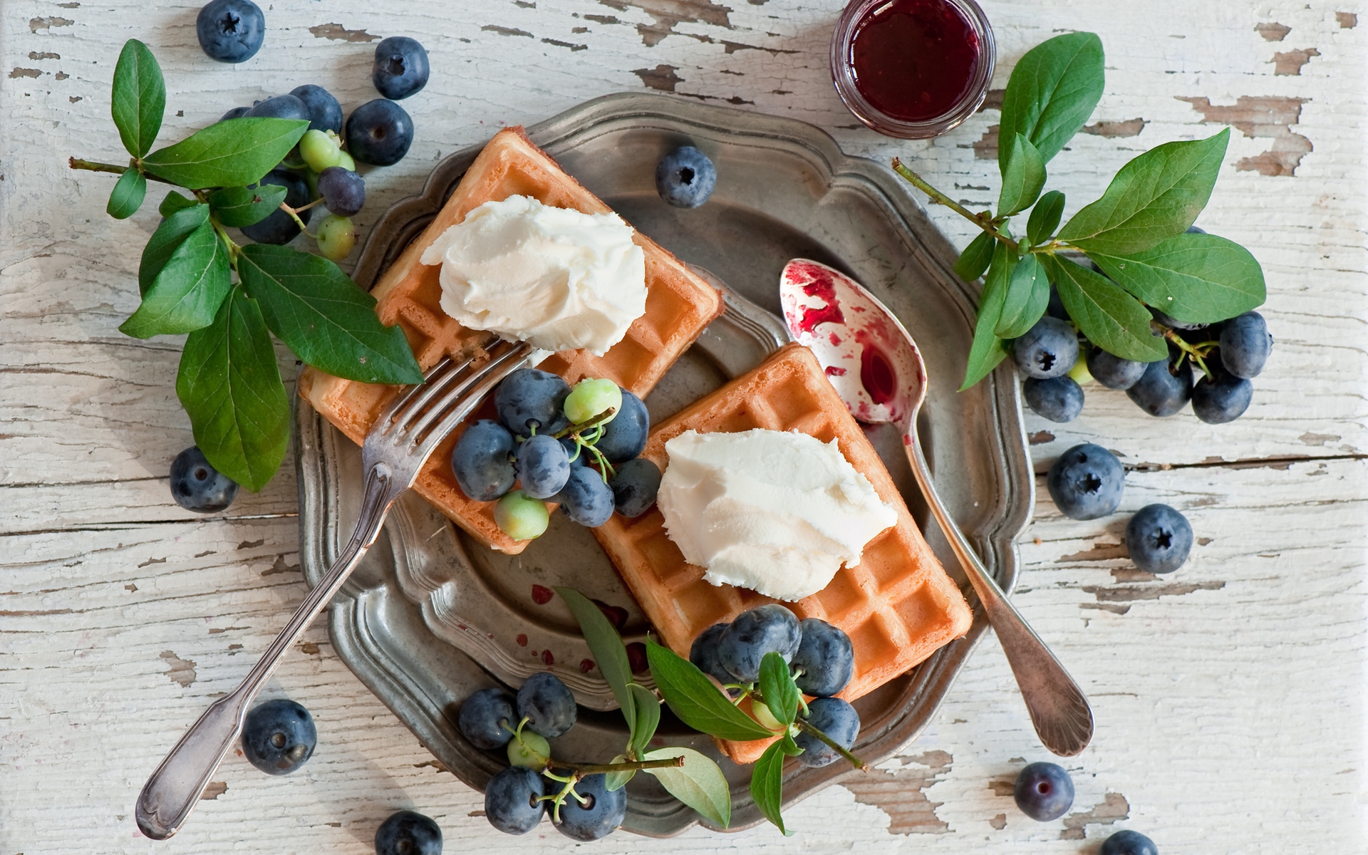 Description: A plate with waffles and blueberries and a fork on it with a cup of coffee and a spoon.
