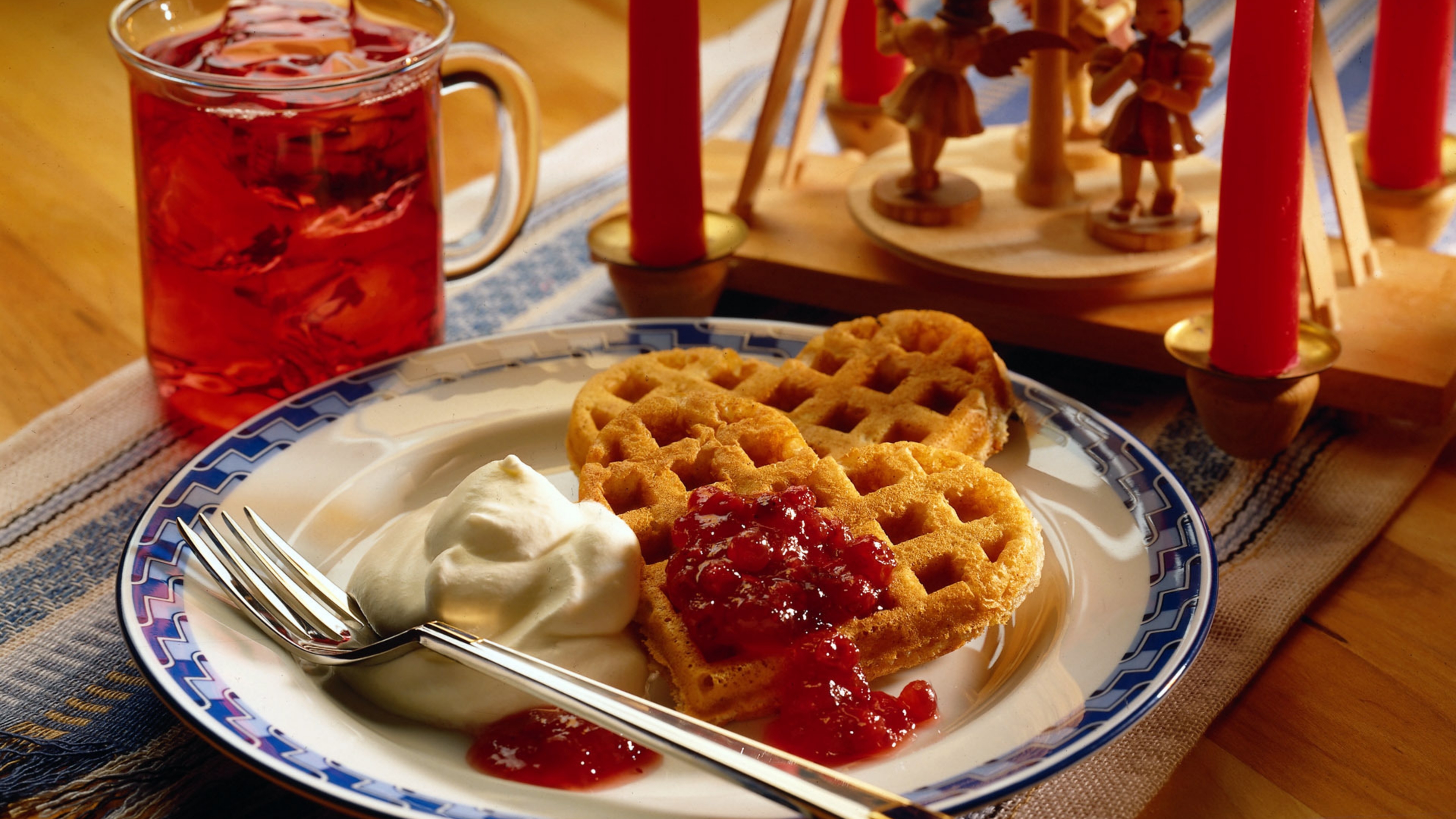 Description: A plate with waffles and ice cream on it with a glass of tea in the background and a candle holder.