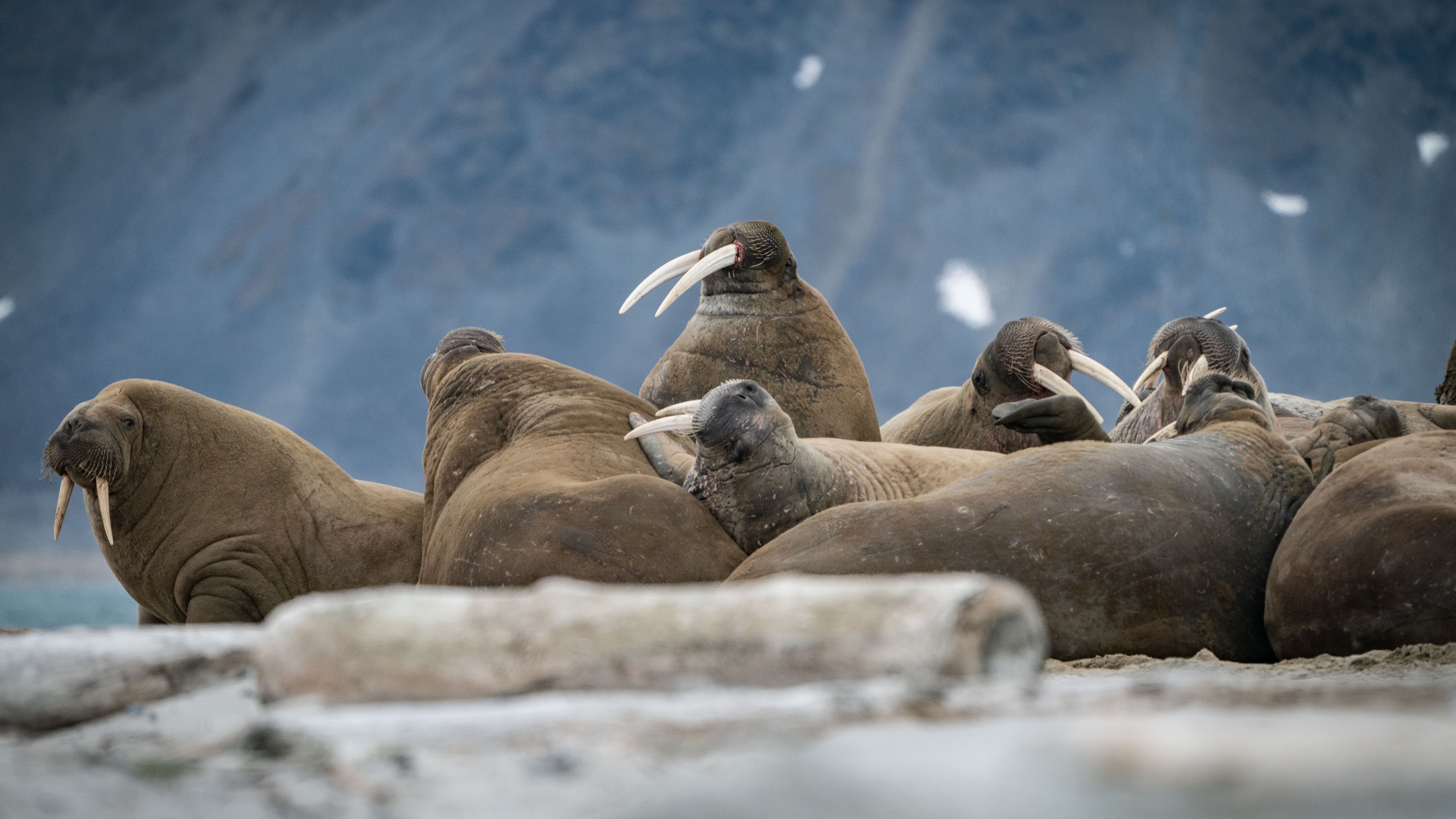 Description: A group of walins sitting on the beach together with a bird in the background and a mountain in the background.