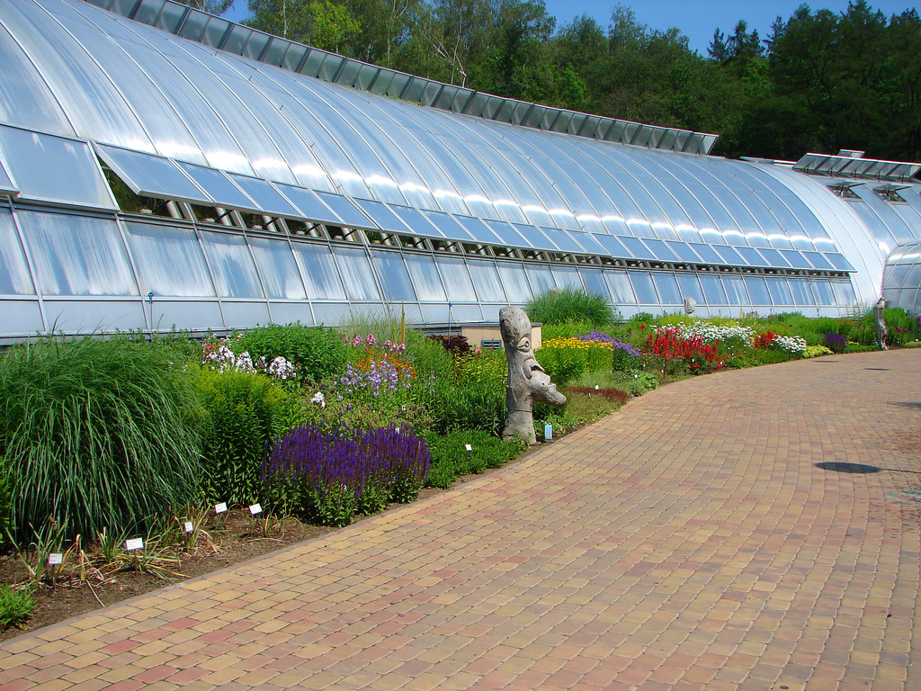Description: A walkway with a building in the background and flowers growing on the side of it and a brick walkway.