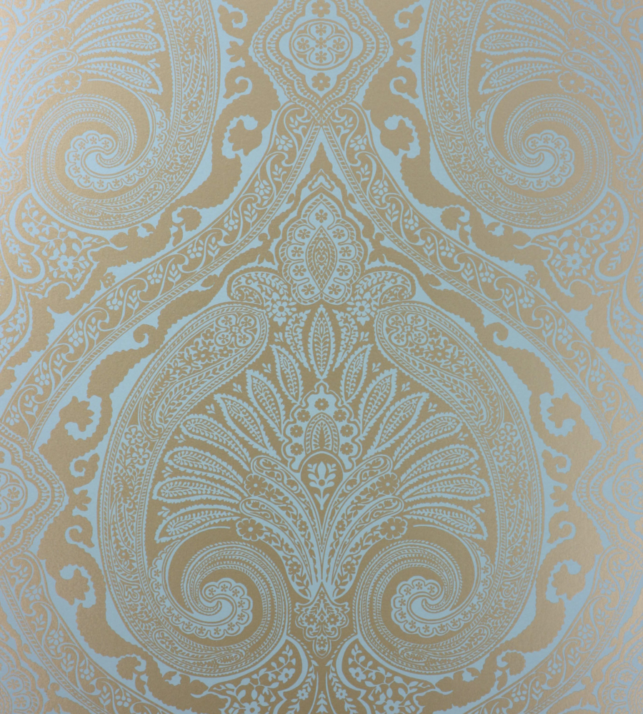 Description: A wall with a pattern on it in a room with a light blue wallpaper and a brown wall.