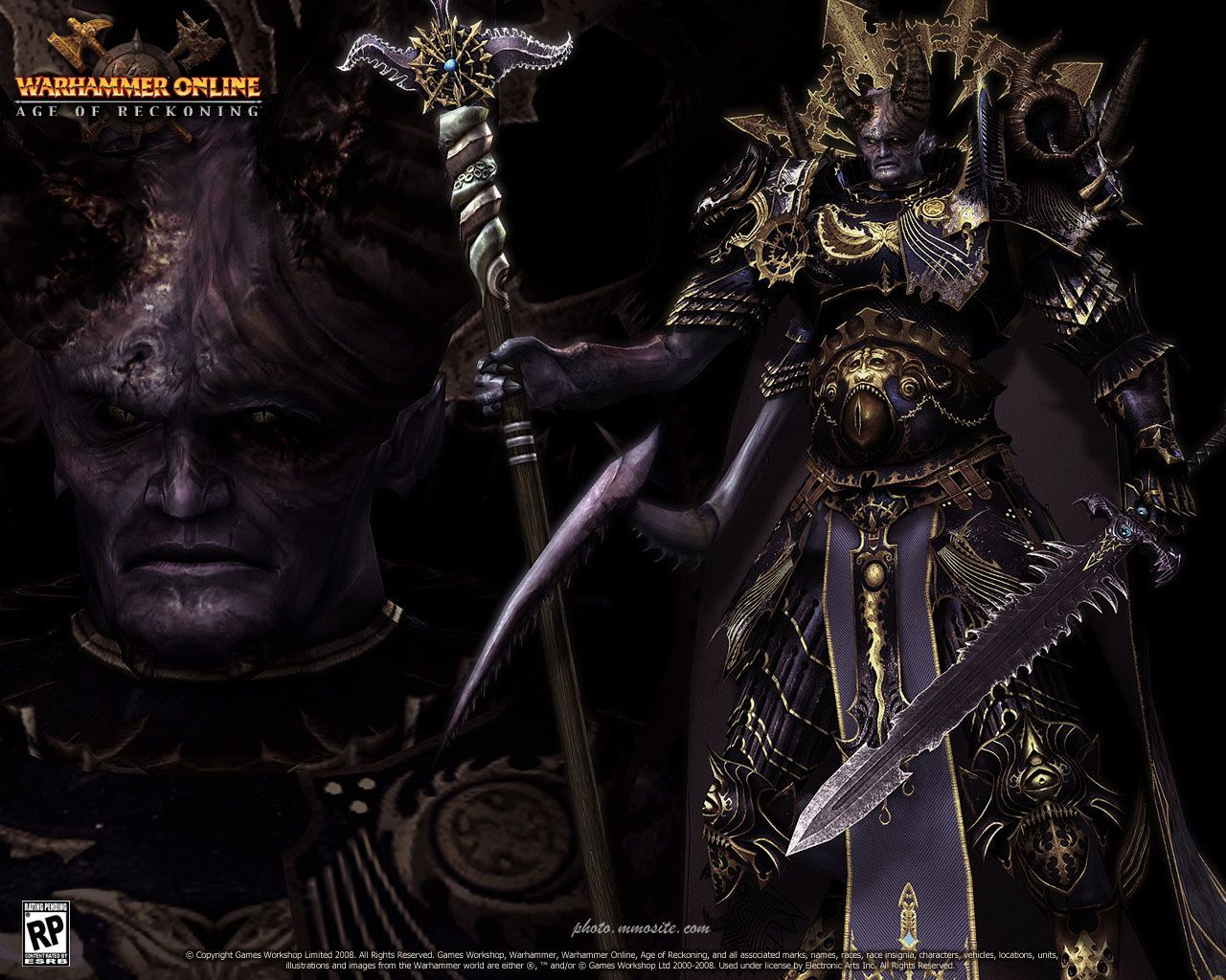 Description: A character from warhammer online holding a sword and a sword in his hand and a demon in his other hand.