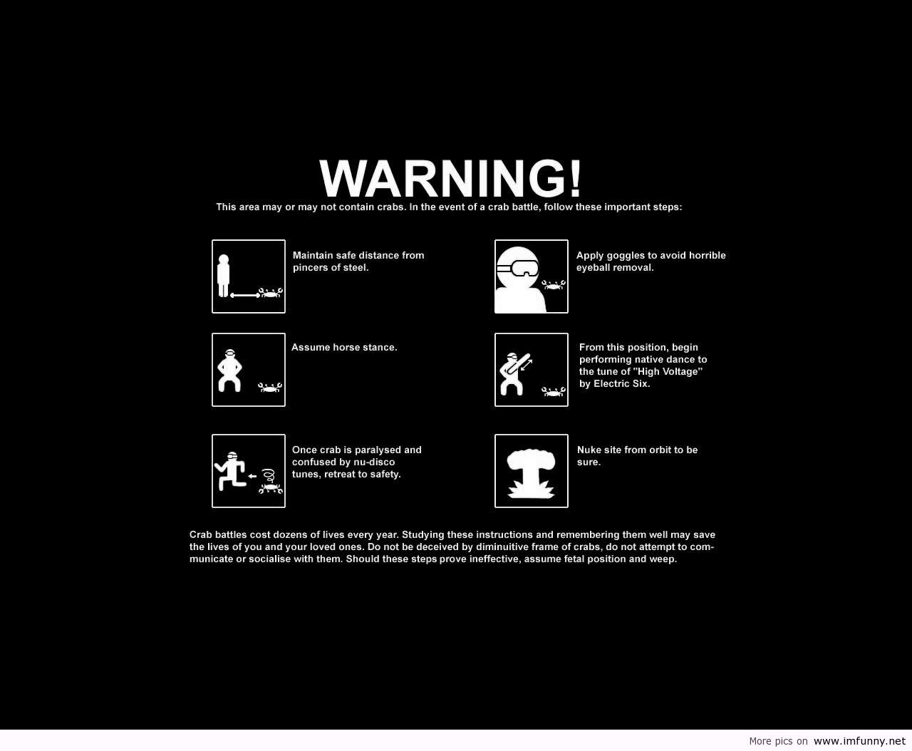 Description: A warning sign with instructions on how to use it in a dark room with a black background and white lettering.