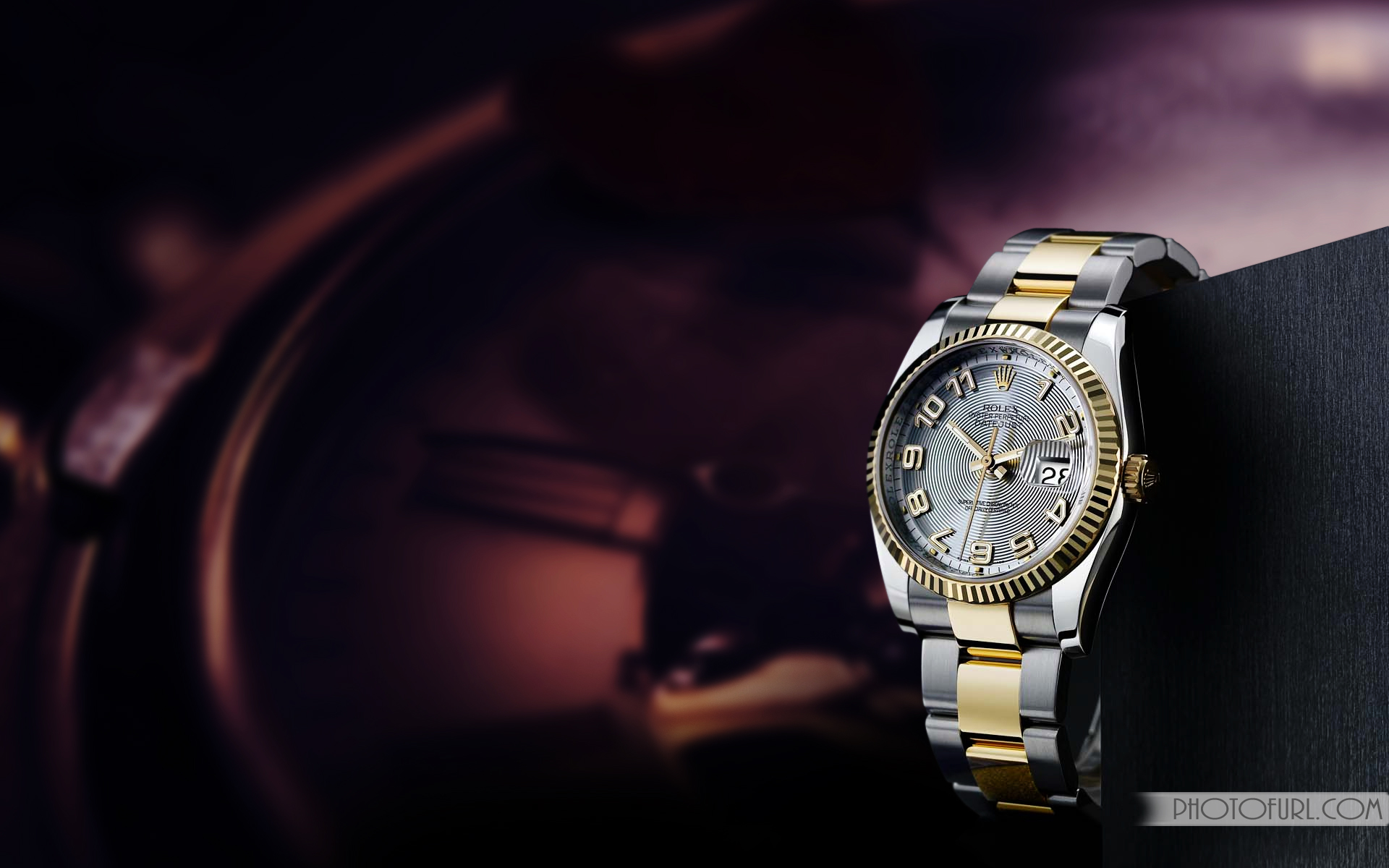 Description: A watch is sitting on a black box with a gold and silver watch face on it's side.