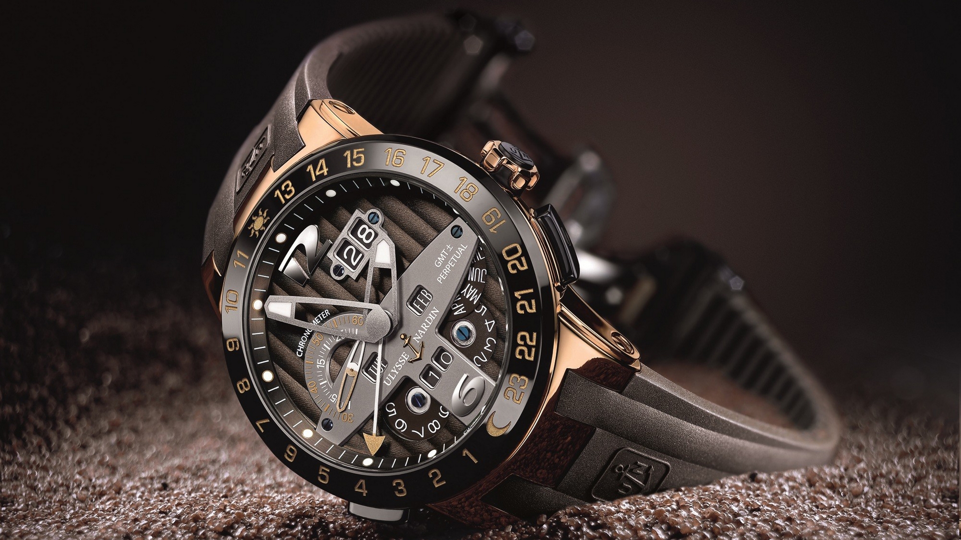 Description: A watch with a black and gold case and a brown strap on a brown surface with a black background.