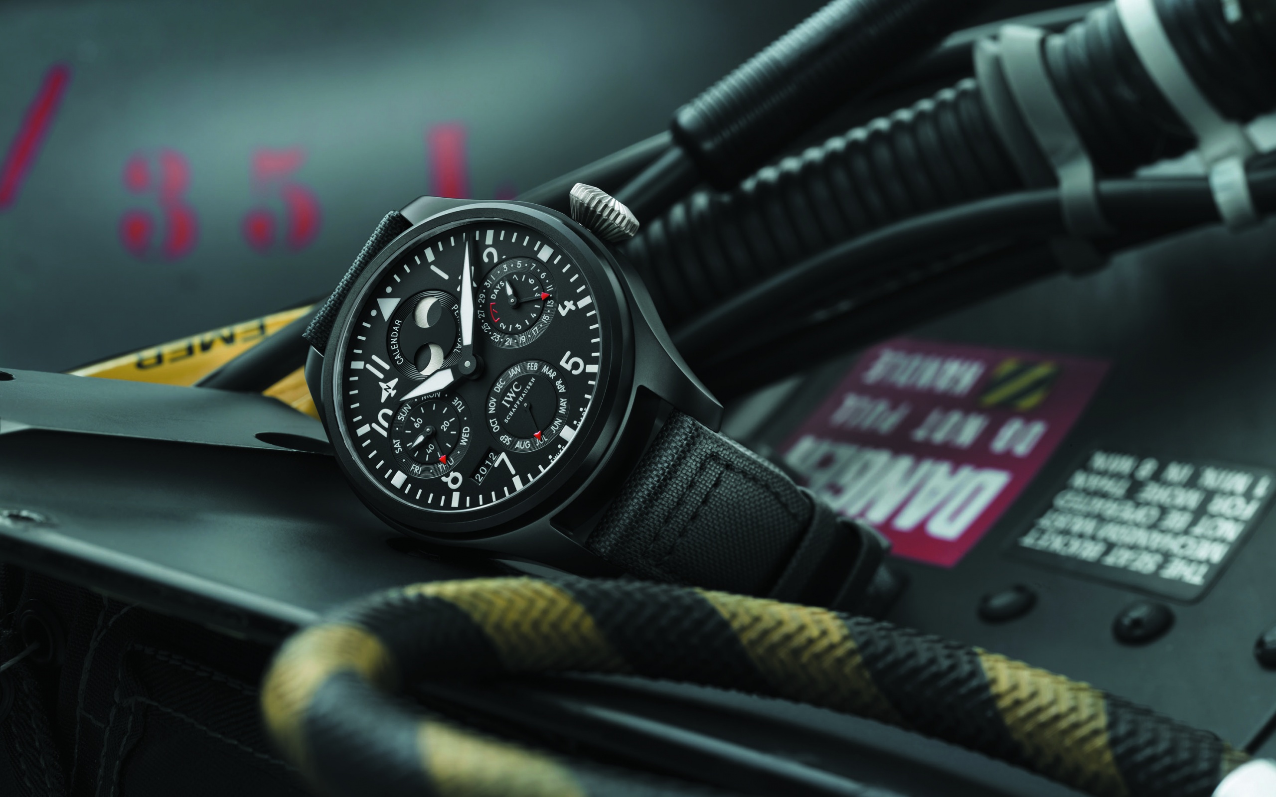 Description: A watch sitting on top of a black table next to a black and yellow cord and a black and yellow strap.