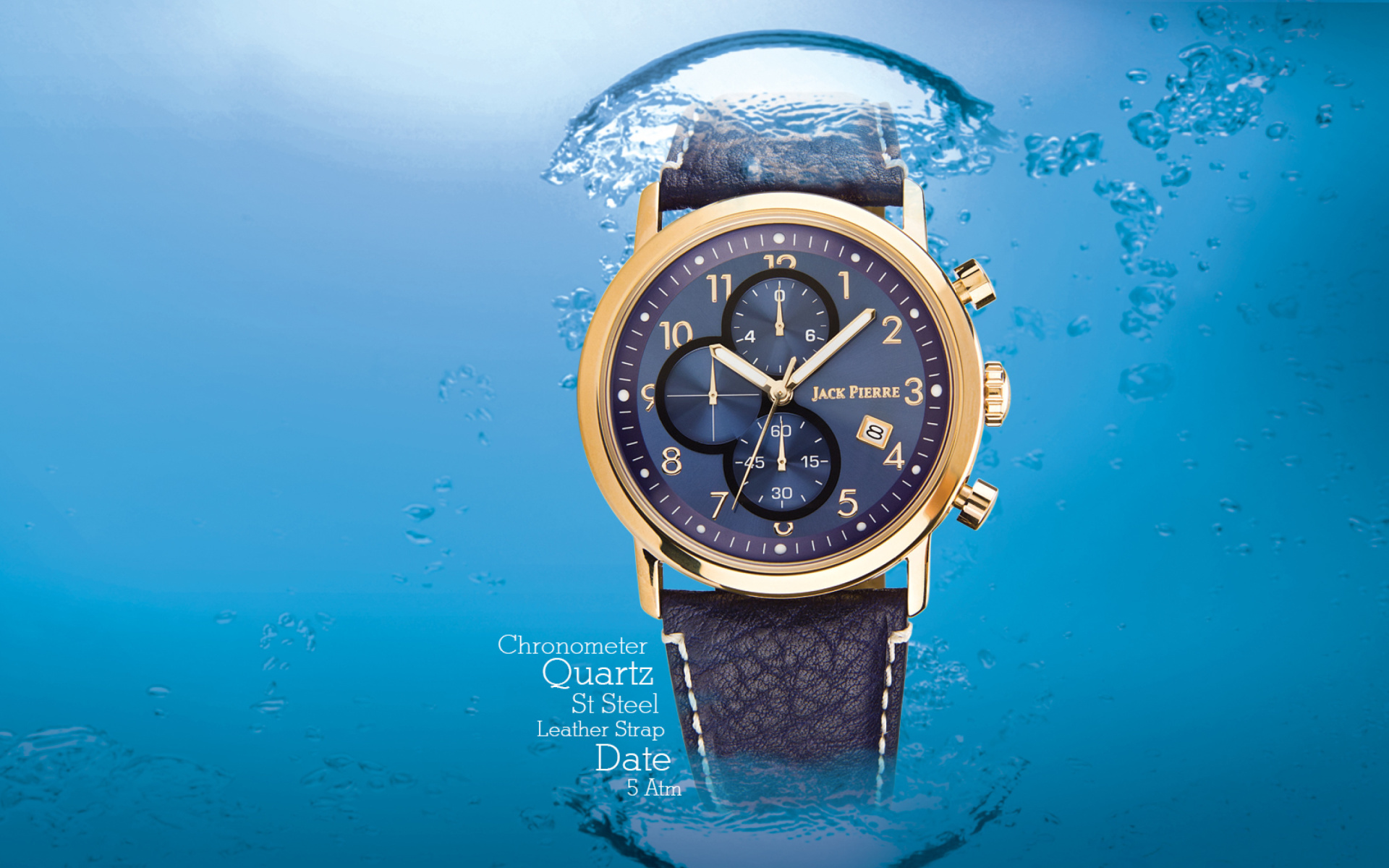 Description: A watch with a blue dial and a gold case on a blue background with water droplets around it and a blue background with a blue background with a blue.