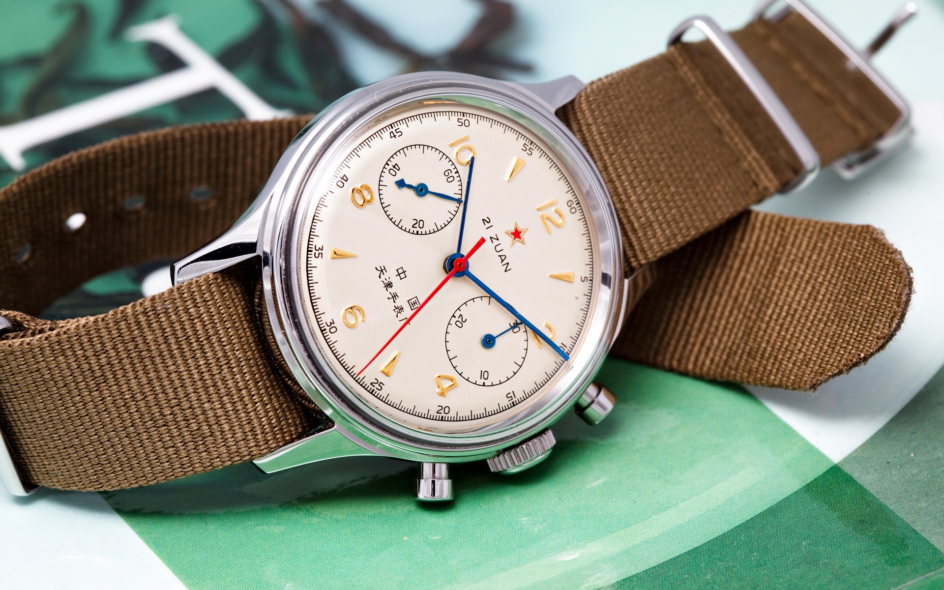 Description: A watch with a brown strap on a green and white checkered tablecloth with a green and white background.