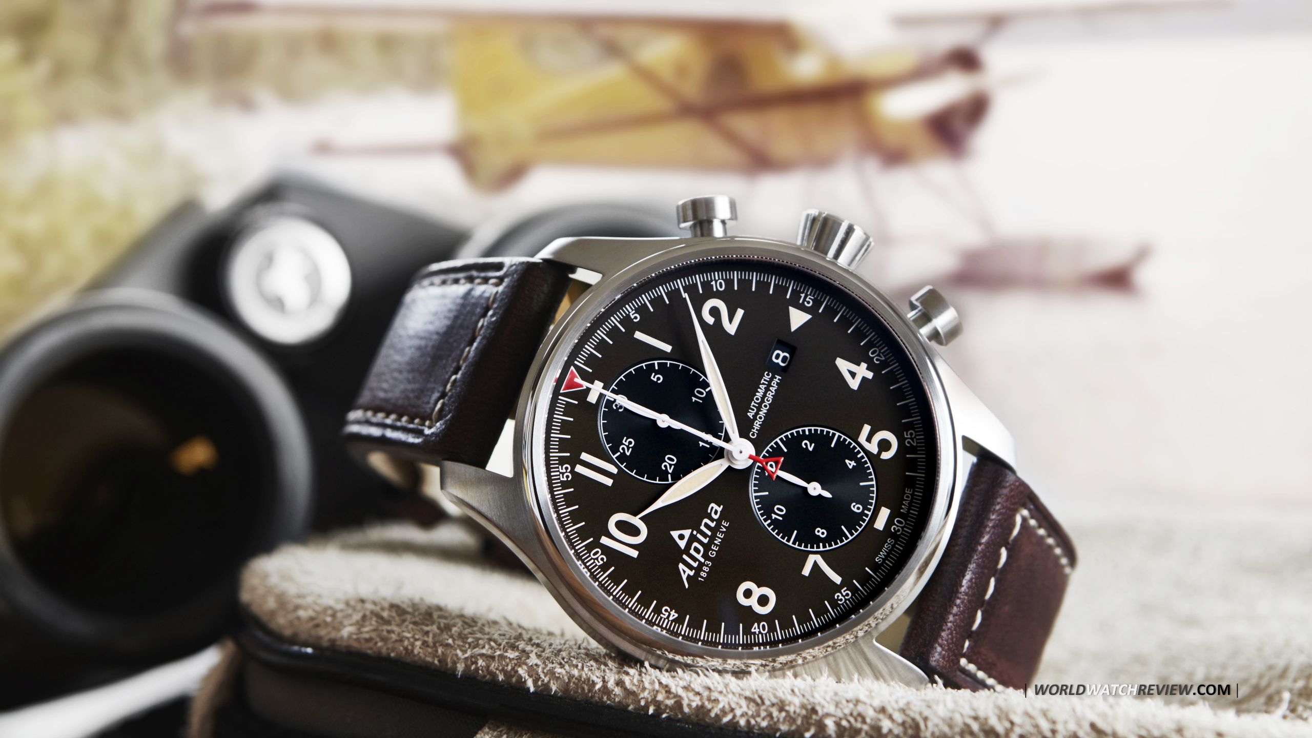 Description: A watch sitting on a table next to a camera and a pair of binoculars on a table with a plane in the background.