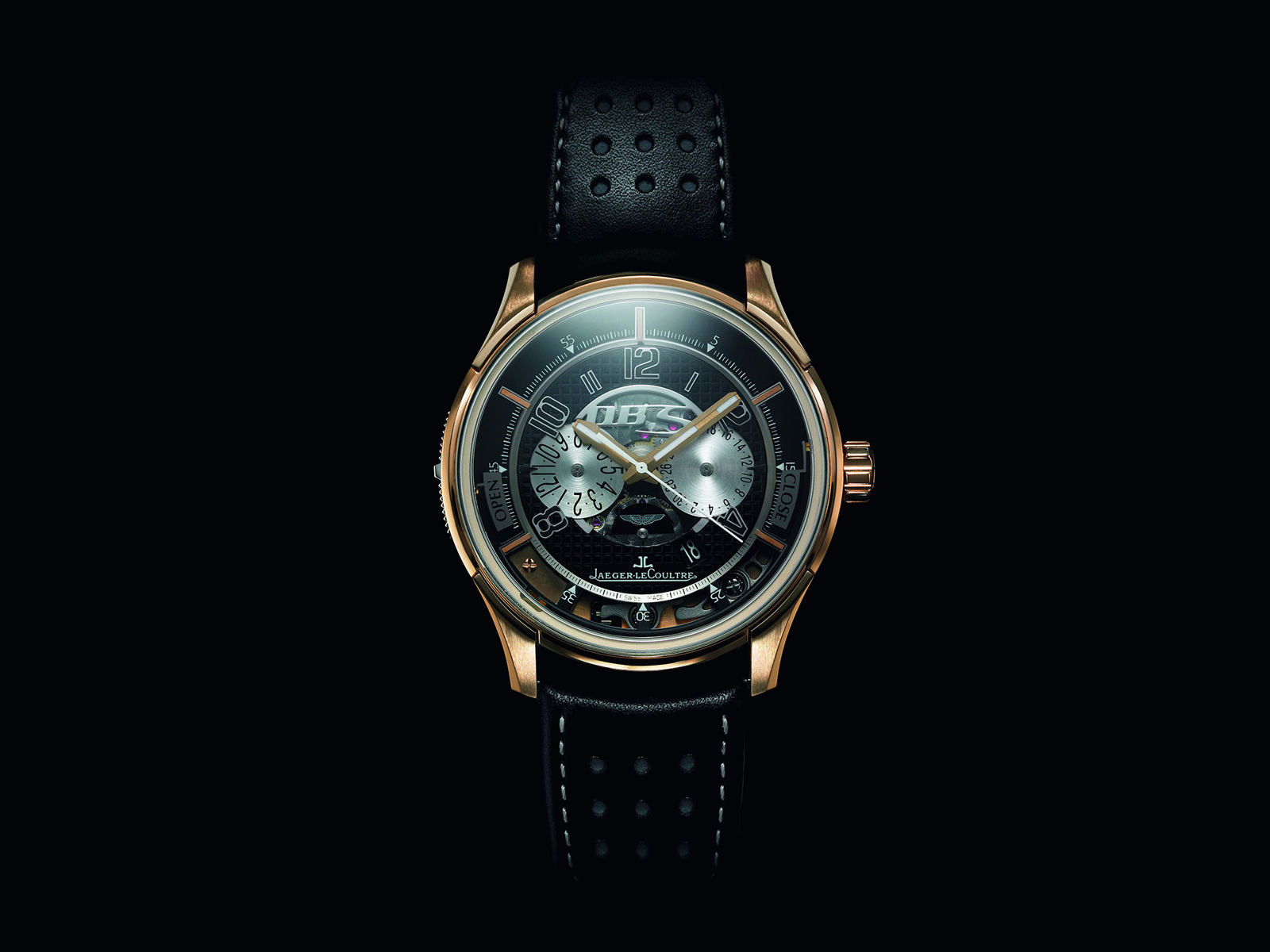 Description: A watch with a black background and a gold case and black strap with a black dial and a white and gold face.