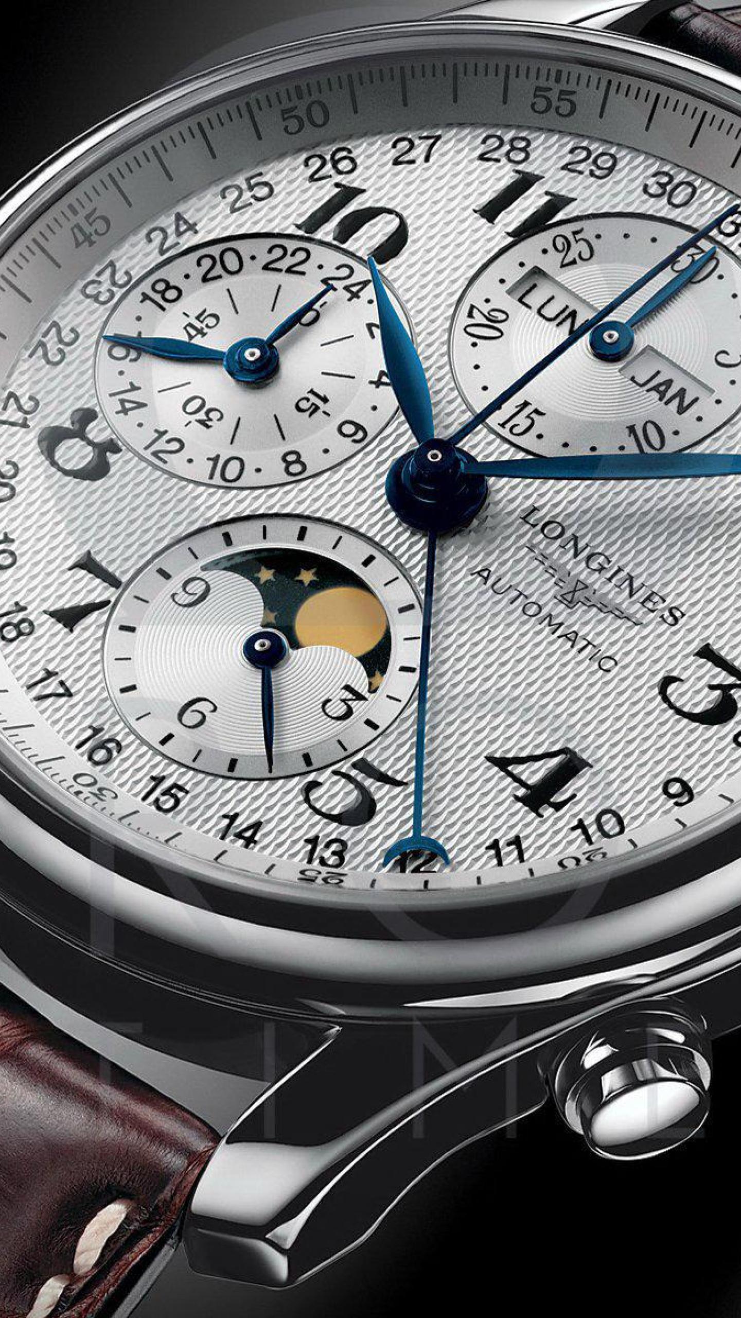 Description: A close up of a watch with a moon on the face of it's face and hands on a black background.