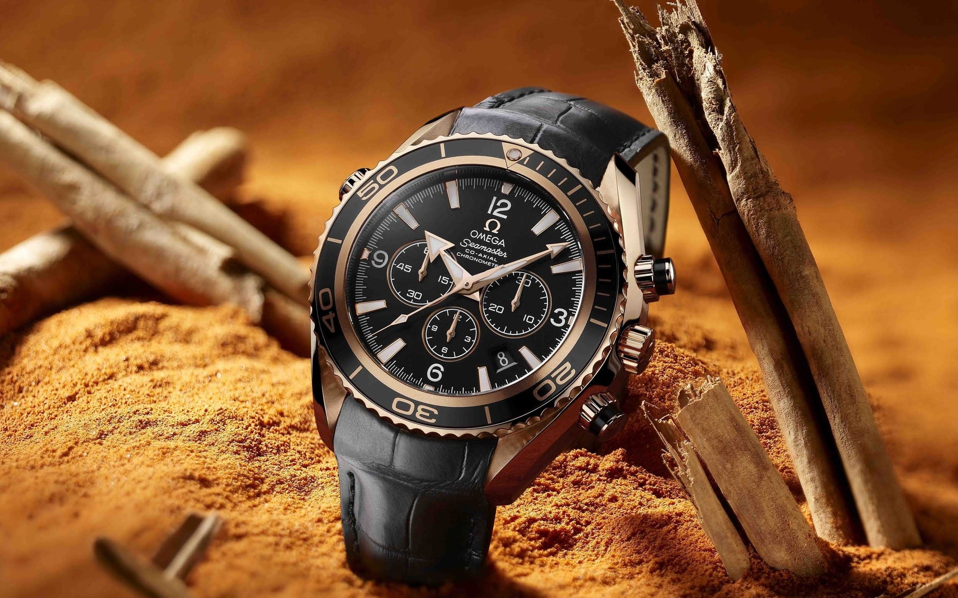 Description: A watch sitting on a pile of sand next to a tree branch and a piece of wood with a stick.