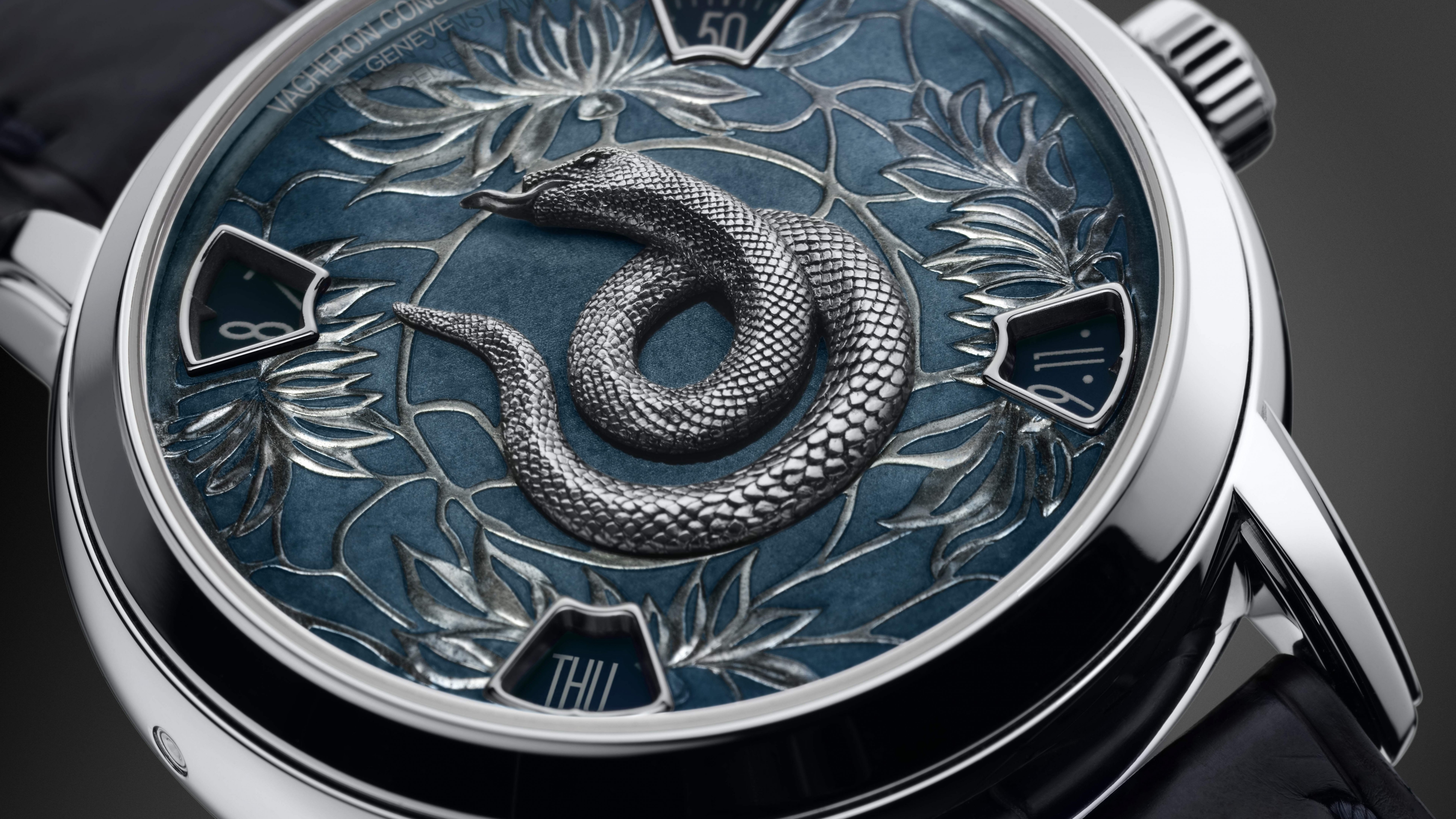 Description: A watch with a snake on the dial and a blue background with leaves and flowers on it.