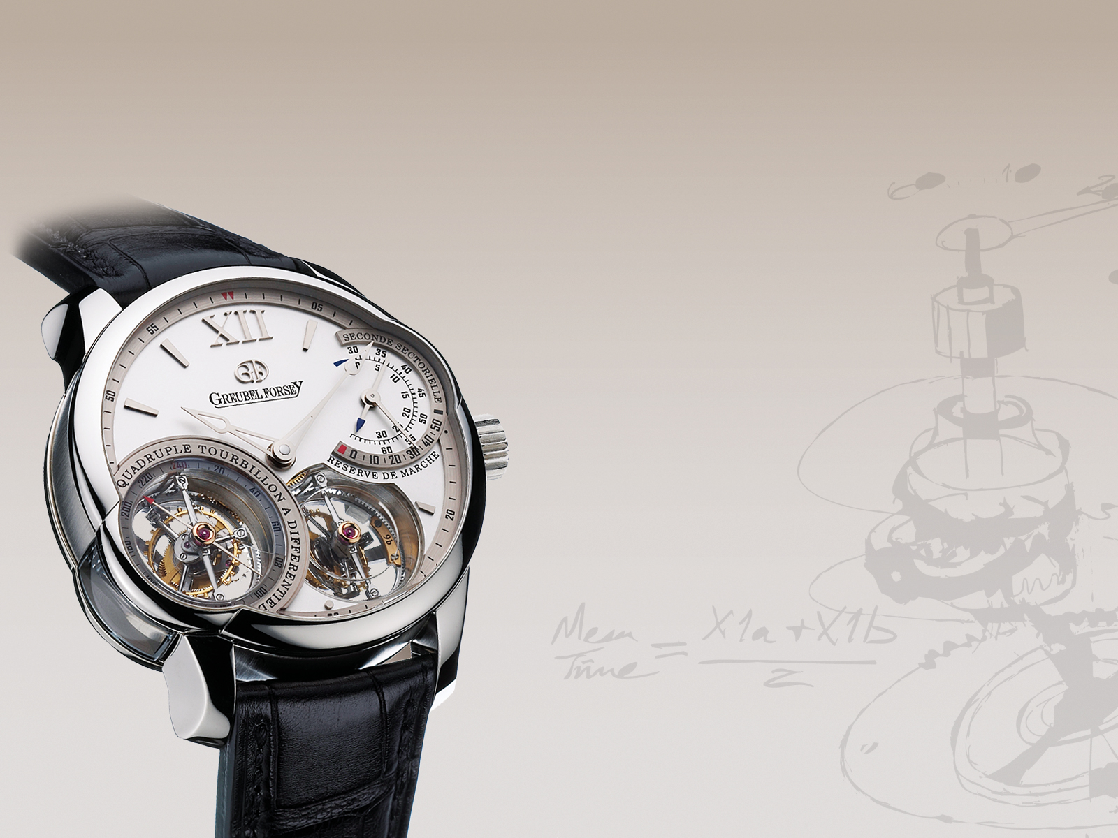 Description: A watch with a white dial and black leather strap on a white background with a drawing of a skeleton.