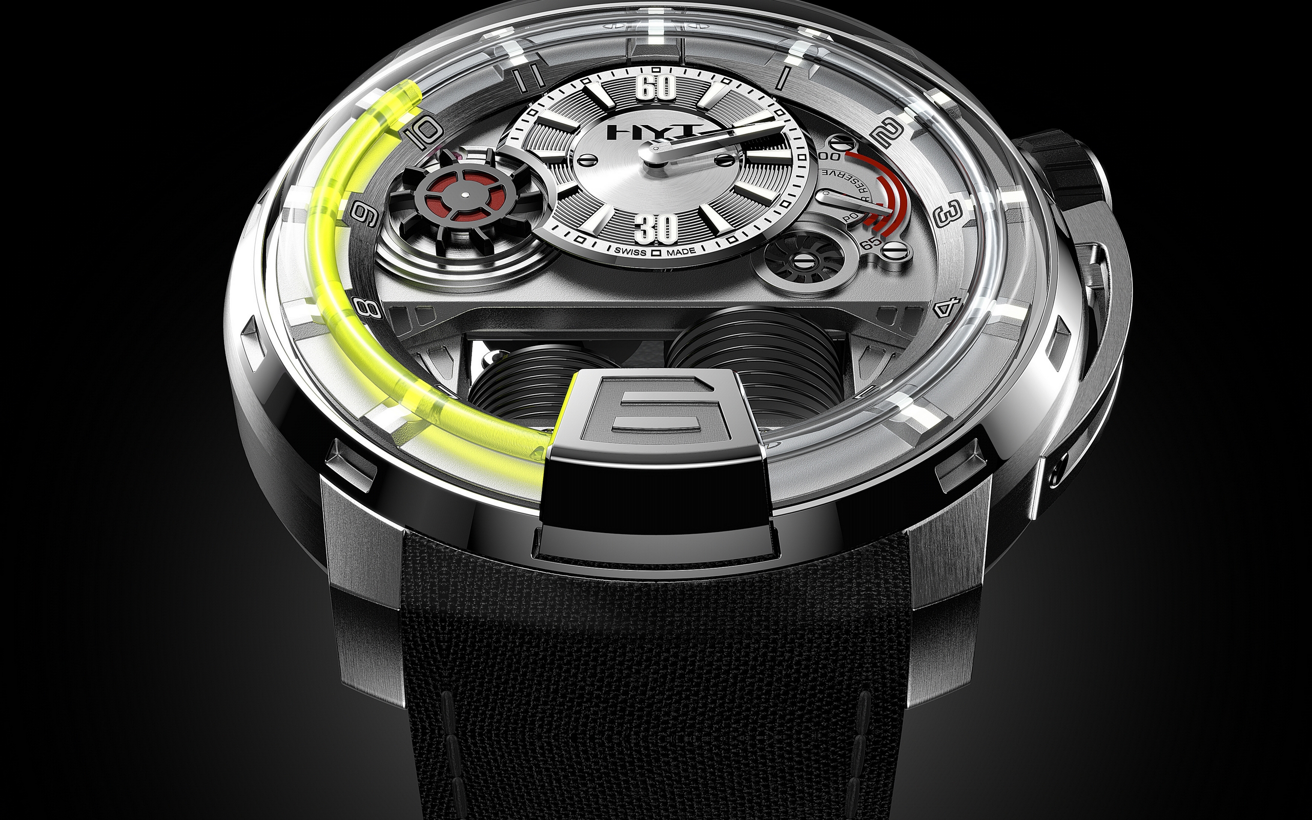 Description: A watch with a yellow light on the side of it's face and a black strap around the wrist.