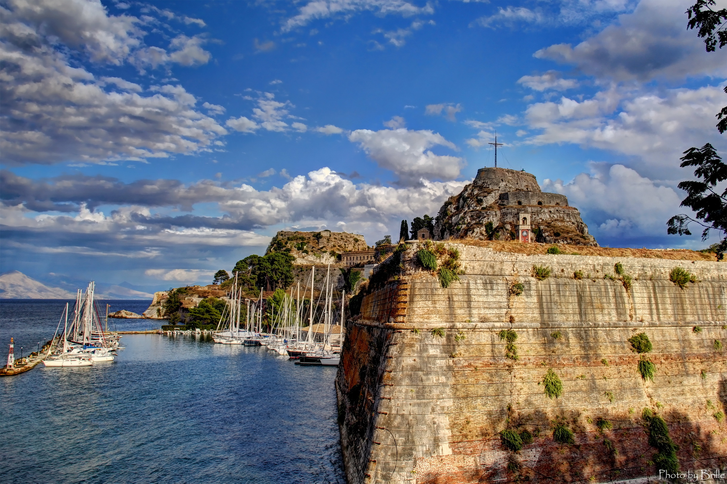Description: A body of water with boats in it and a rock outcropping on the side of it.