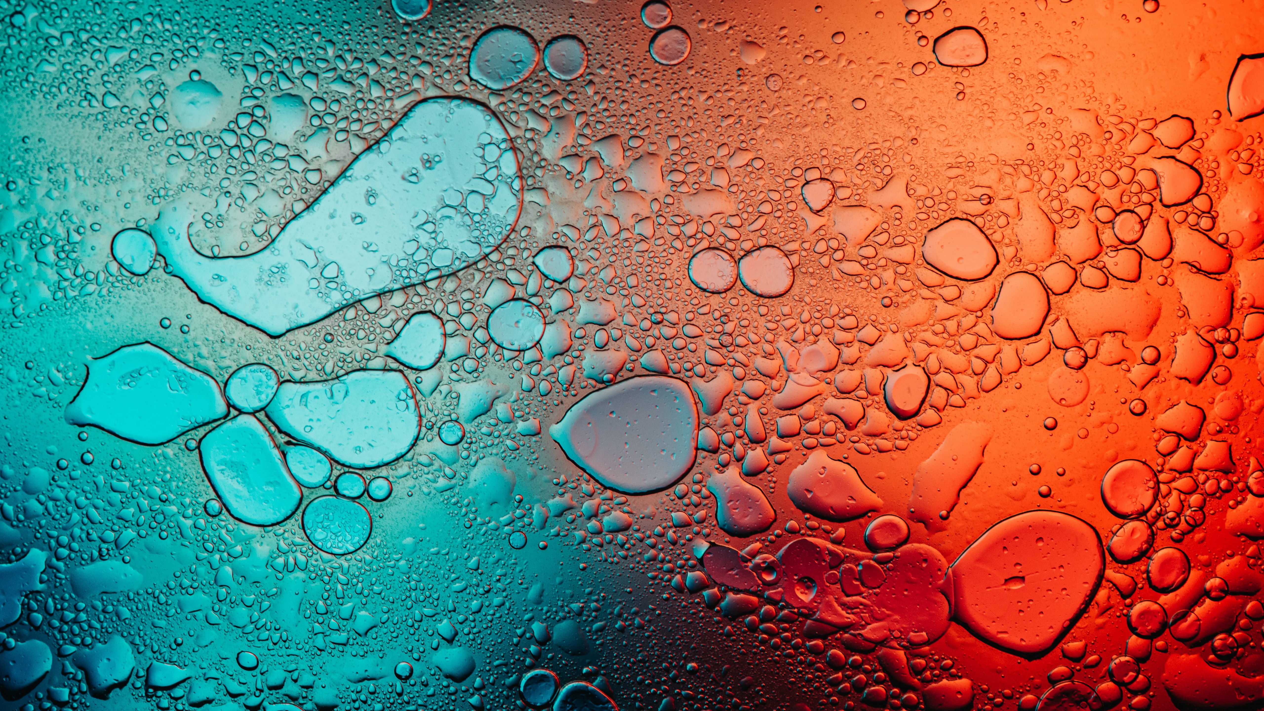 Description: A close up of water bubbles on a colorful surface with a red and blue background and a green and orange background.