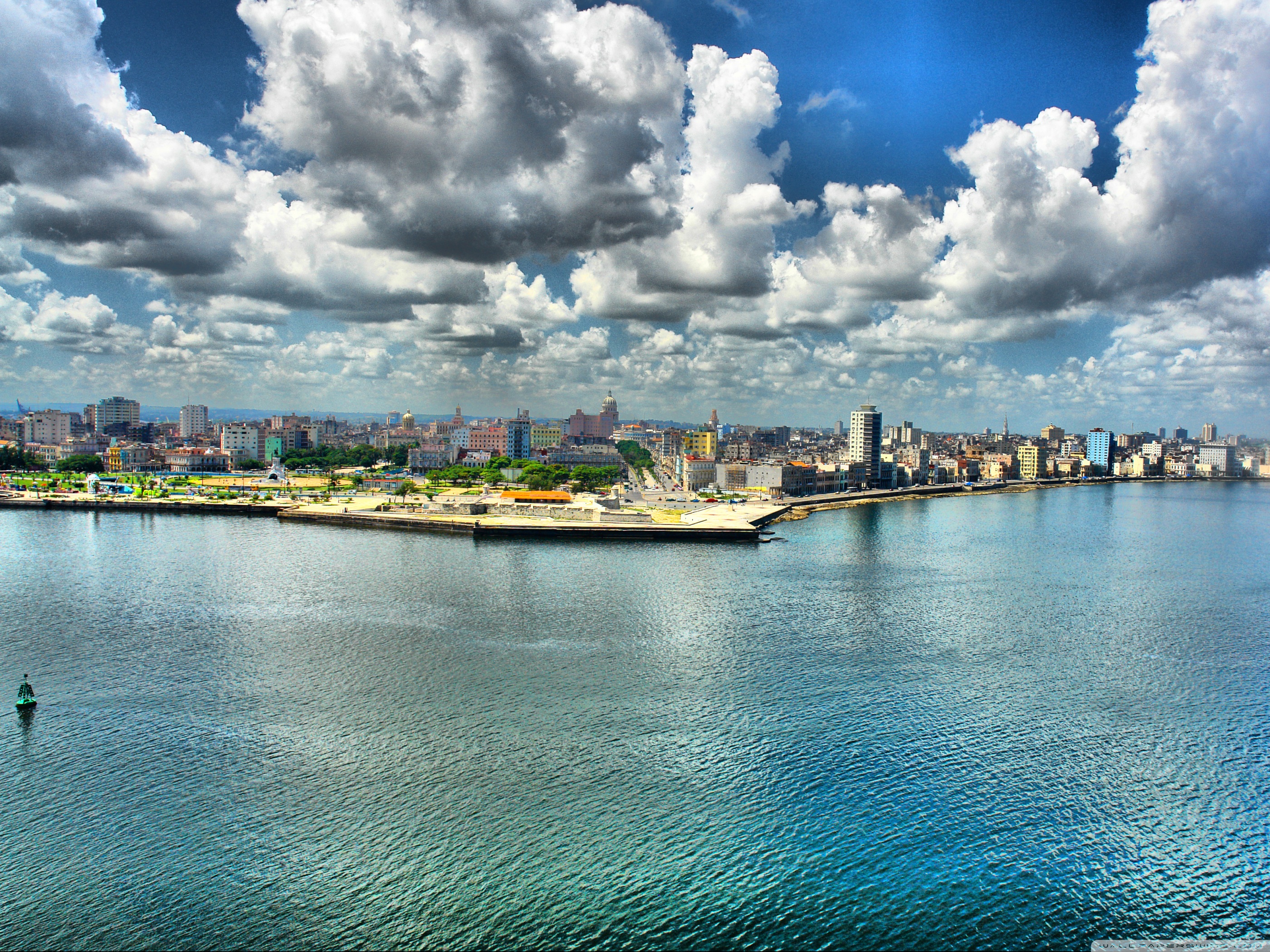 Description: A body of water with a city in the background and clouds in the sky above it and a person in a green boat.