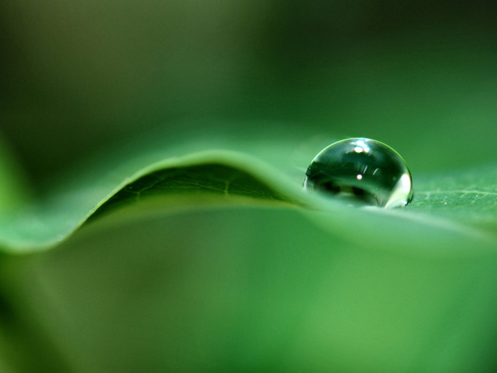 Description: A drop of water on a green leaf with a blurry background of the leaves and the water drop.