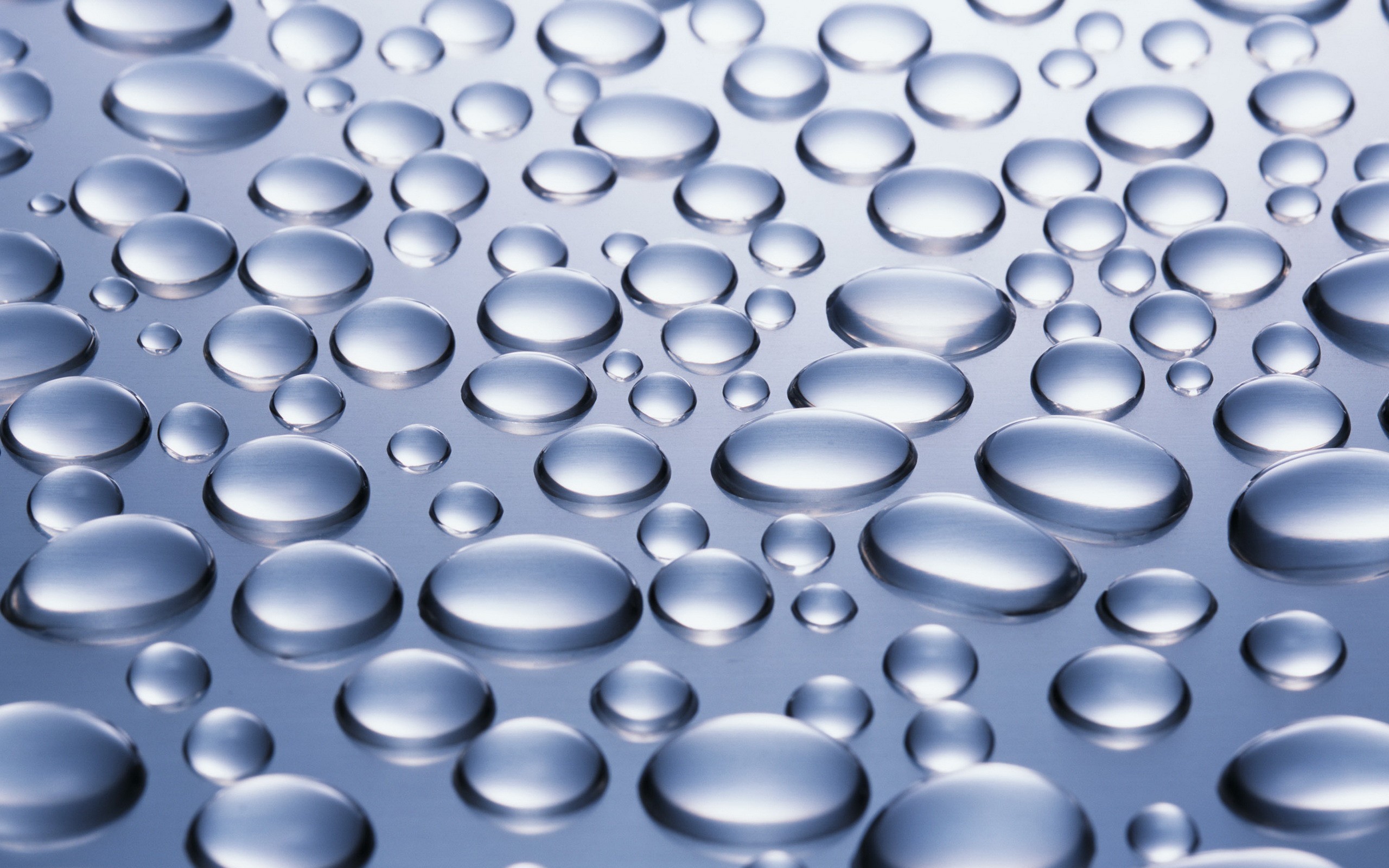Description: A lot of water droplets on a surface of water with a blue background and a blurry image of the water droplets.