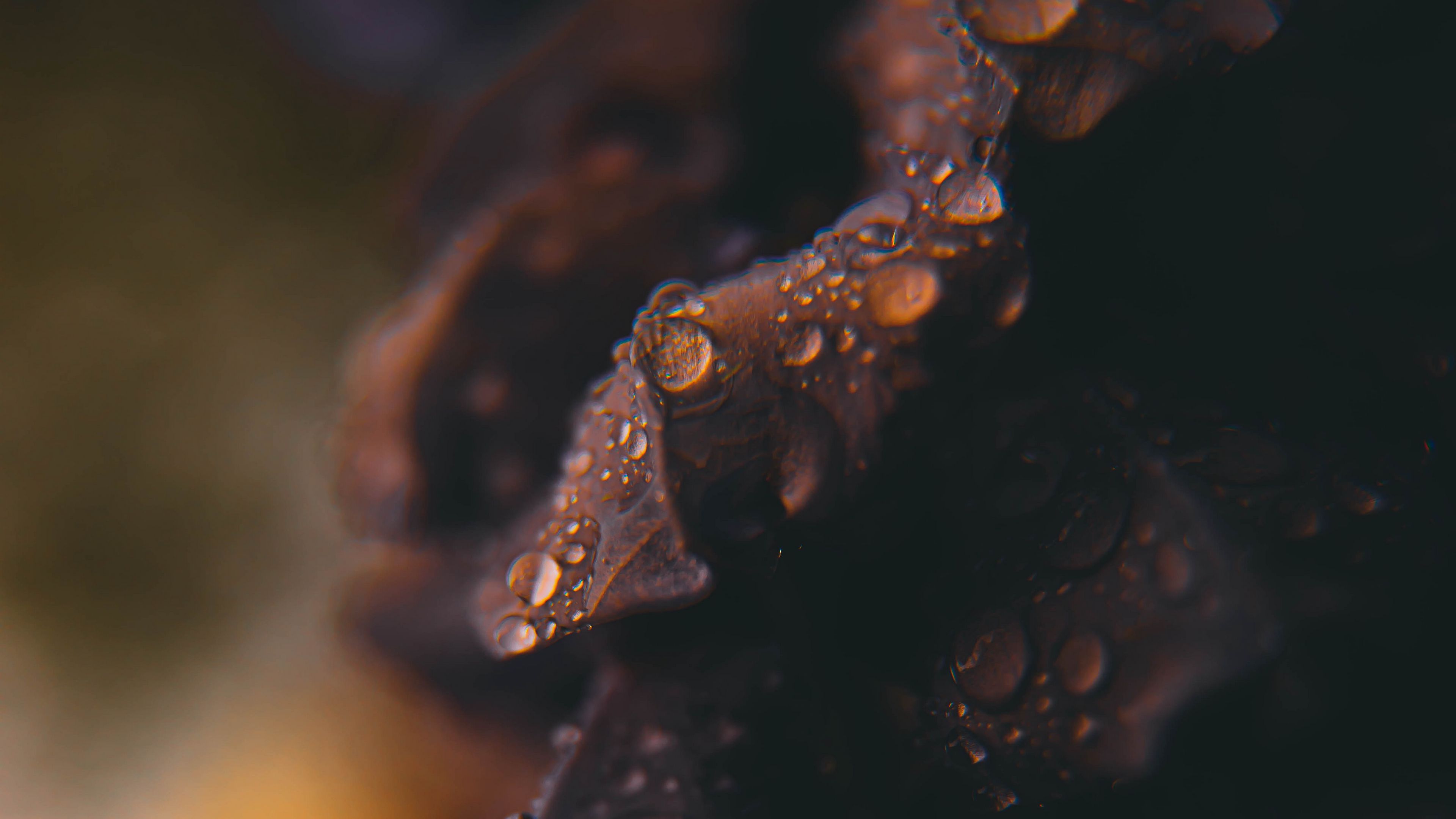 Description: A close up of water droplets on a leafy plant stem with a blurry background of leaves and stems.