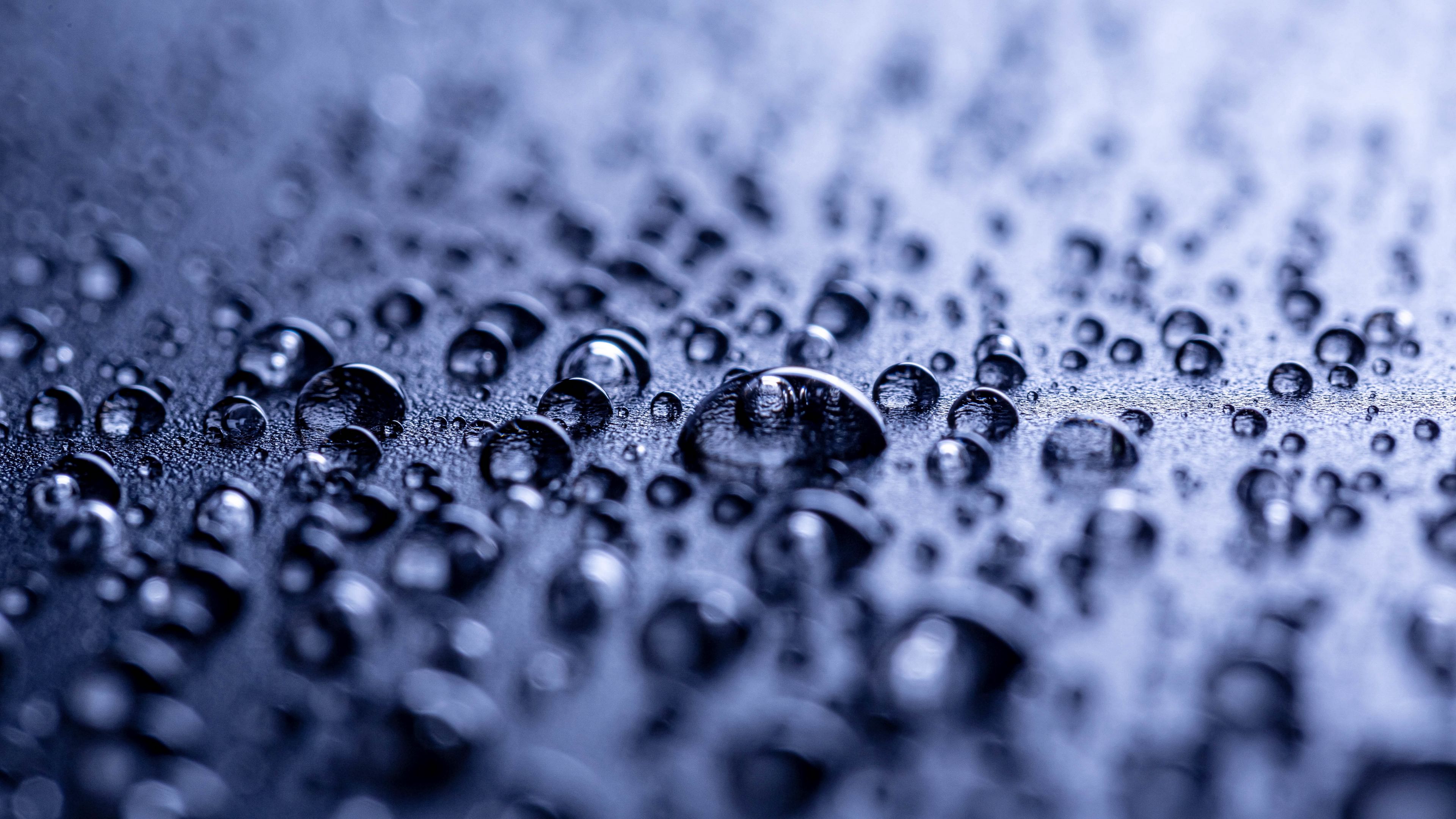 Description: A close up of water droplets on a surface of water with a blue background and a black border with a white border.