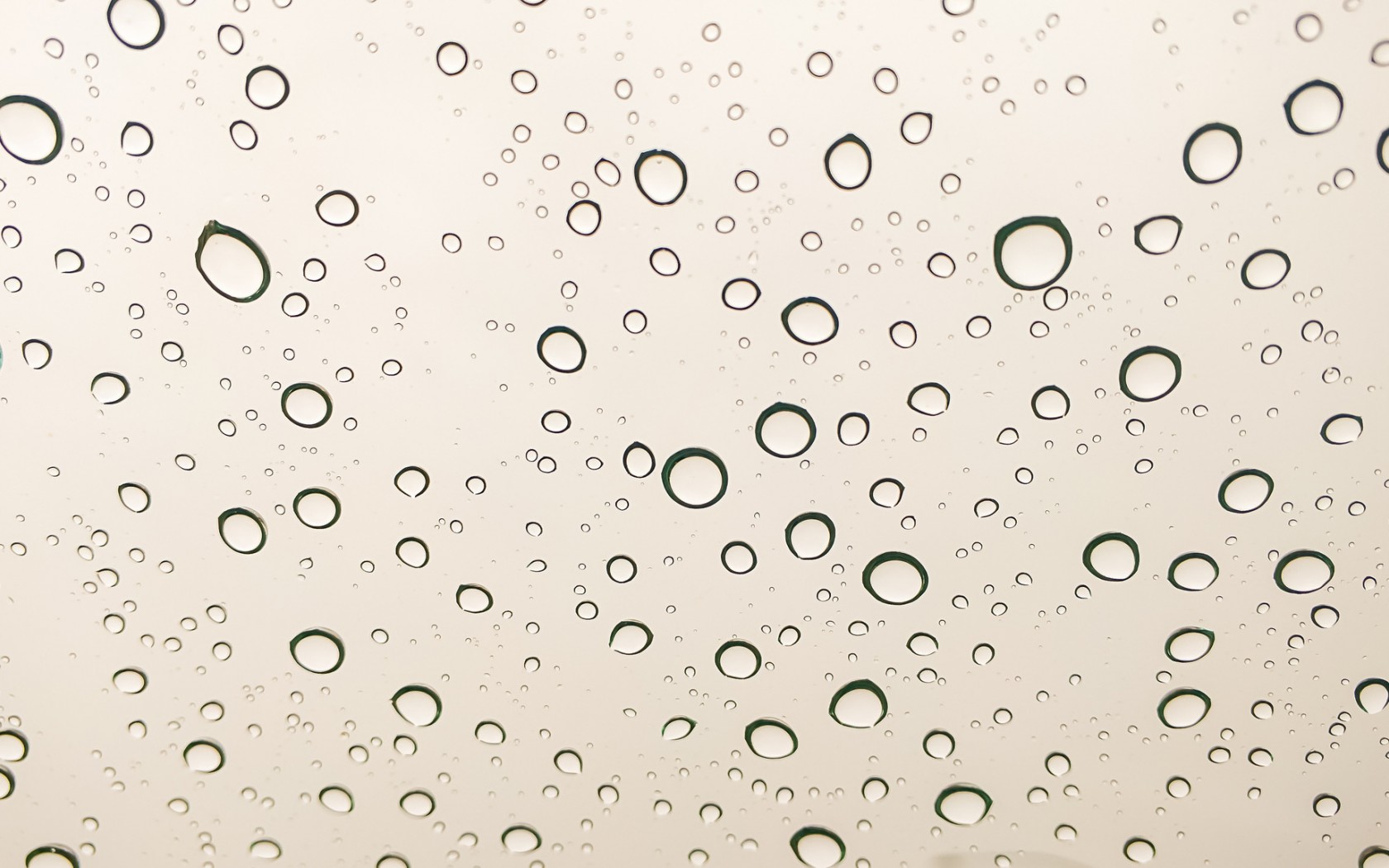 Description: A window with water drops on it and a sky background with a green circle on the glass and a white wall.