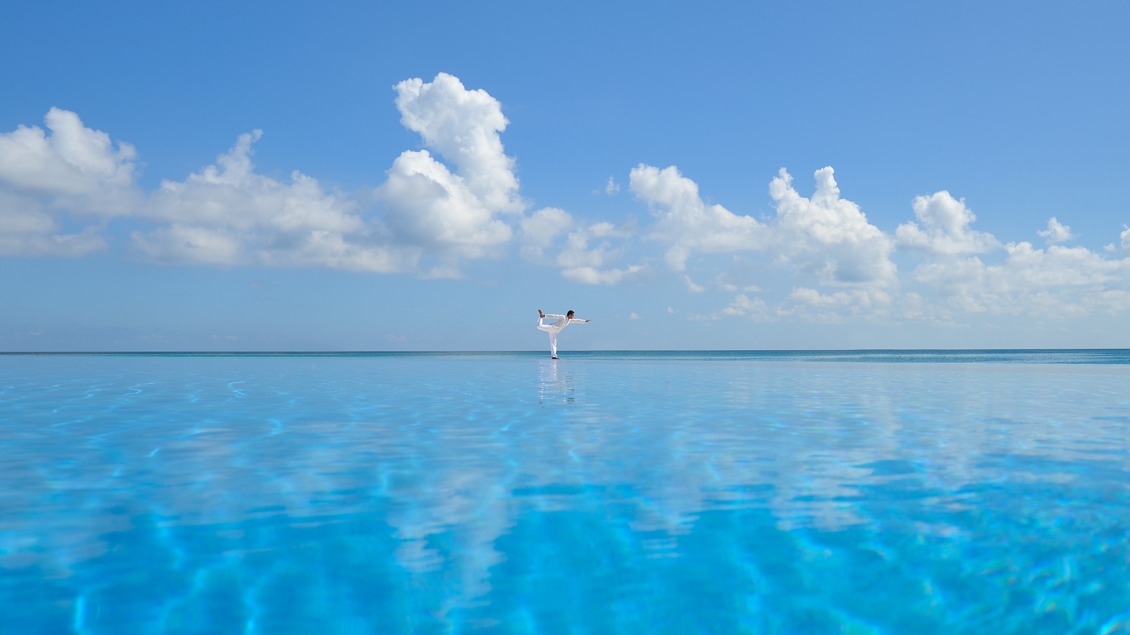 Description: A person standing in the middle of a large body of water with their arms outstretched in the air.