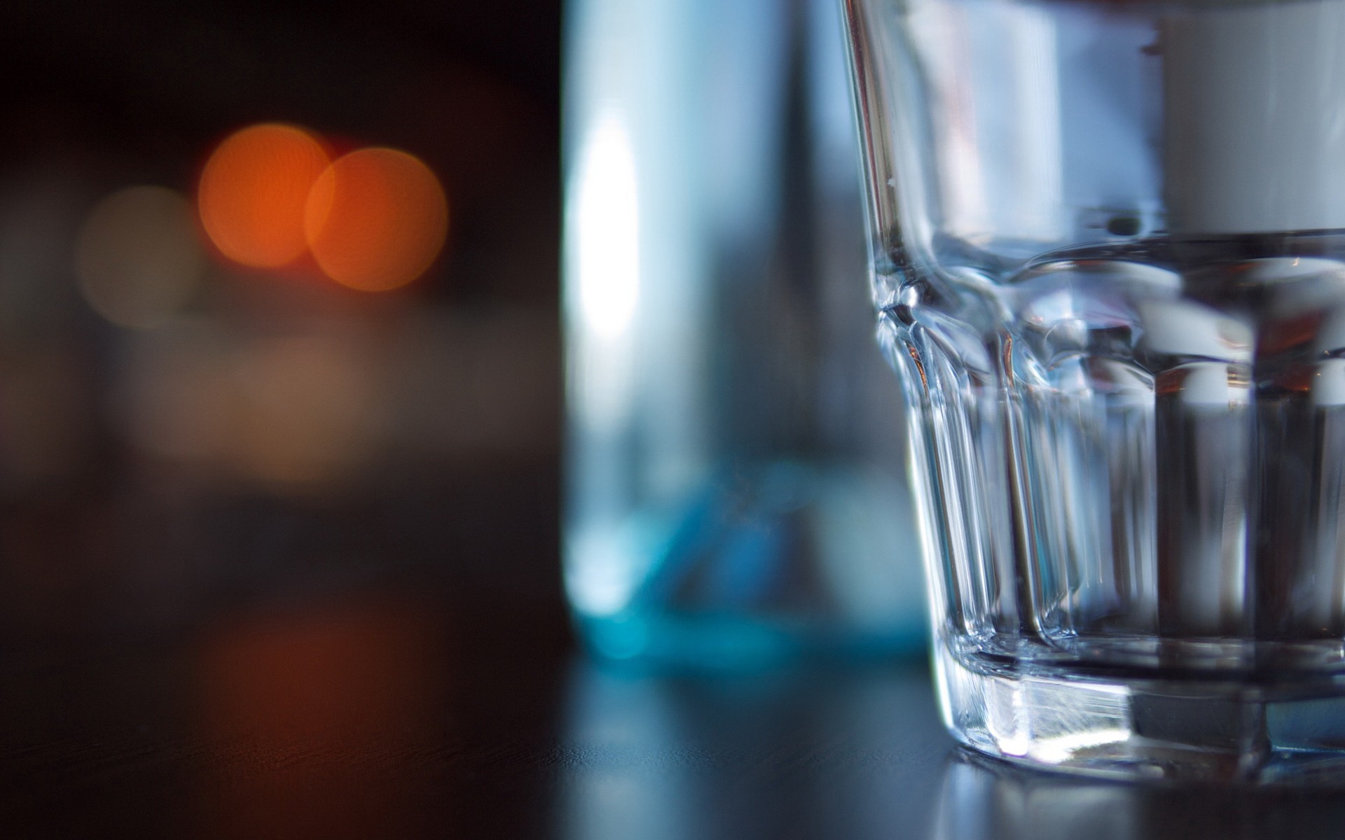 Description: A glass of water with a blurry background of lights in the background and a blurry background of a glass.