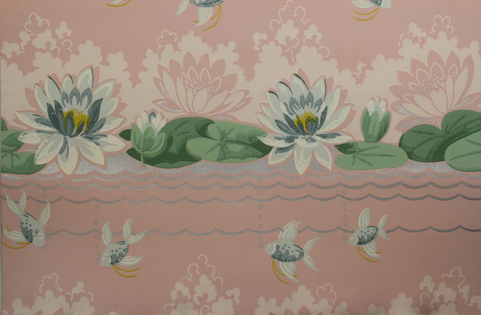 Description: A painting of water lilies and lily pads on a pink background with a gold border and a gold fish.