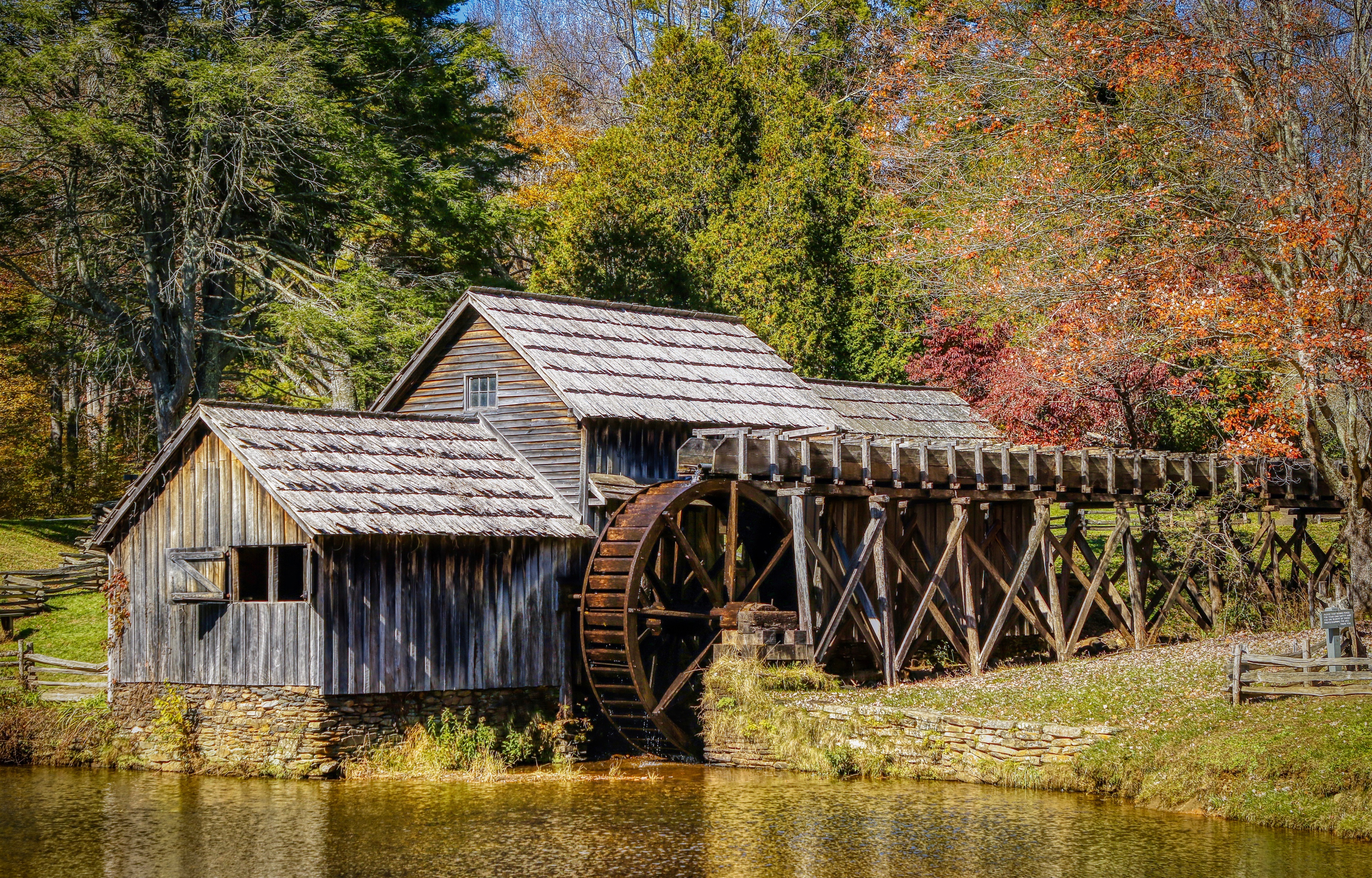 Description: A water mill with a wooden building next to it and trees in the background with leaves on the ground.