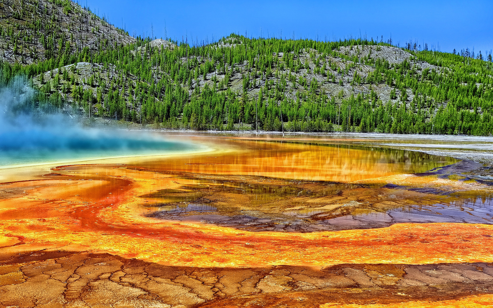 Description: A large body of water surrounded by trees and a mountain range in the background with a blue sky and yellow and orange substance.