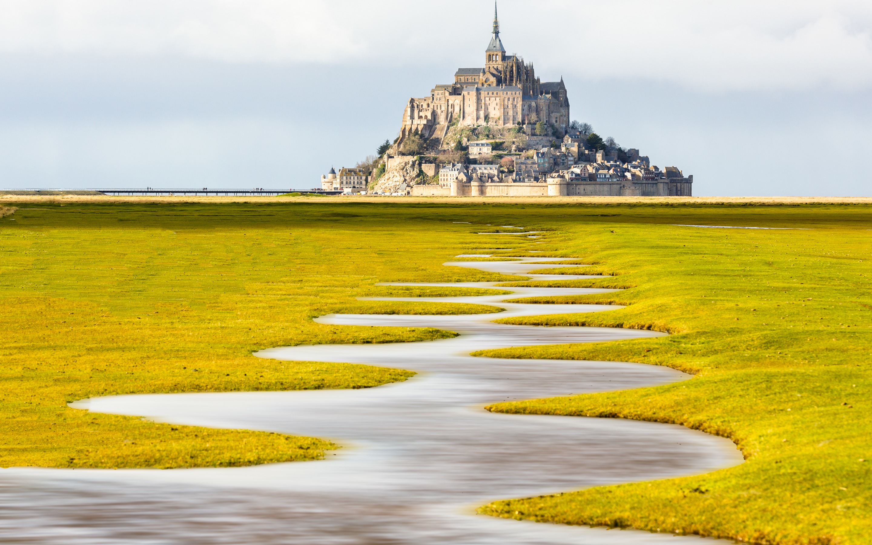 Description: A long path of water leading to a castle in the distance with a sky background and a grassy field with a river running through it.