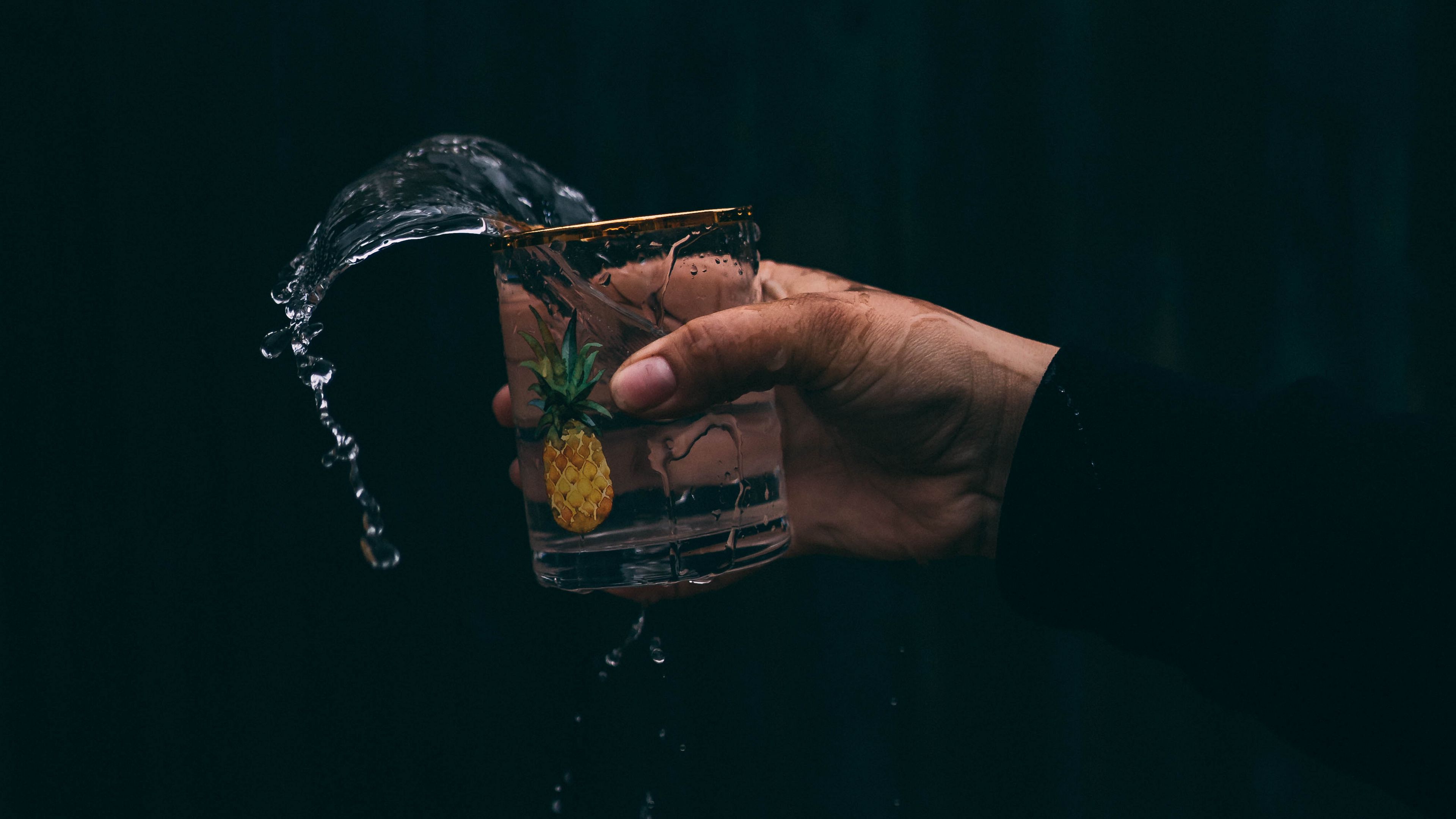 Description: A person holding a glass with a pineapple on it and a water stream coming out of it to the glass.